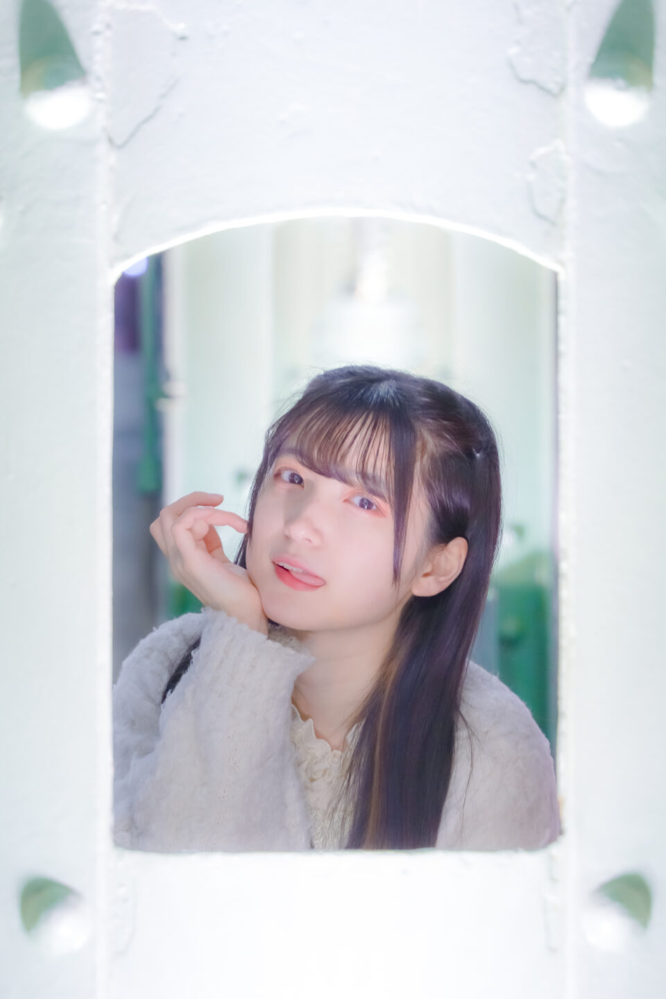 広角だけでなく望遠側でも手ブレ補正効果は強力なので、158mmの手持ち撮影も大丈夫です。このカットは、あざと可愛い表情を依頼したのですが、流石の現役アイドルは瞬間に、この表情で応えてくれました。