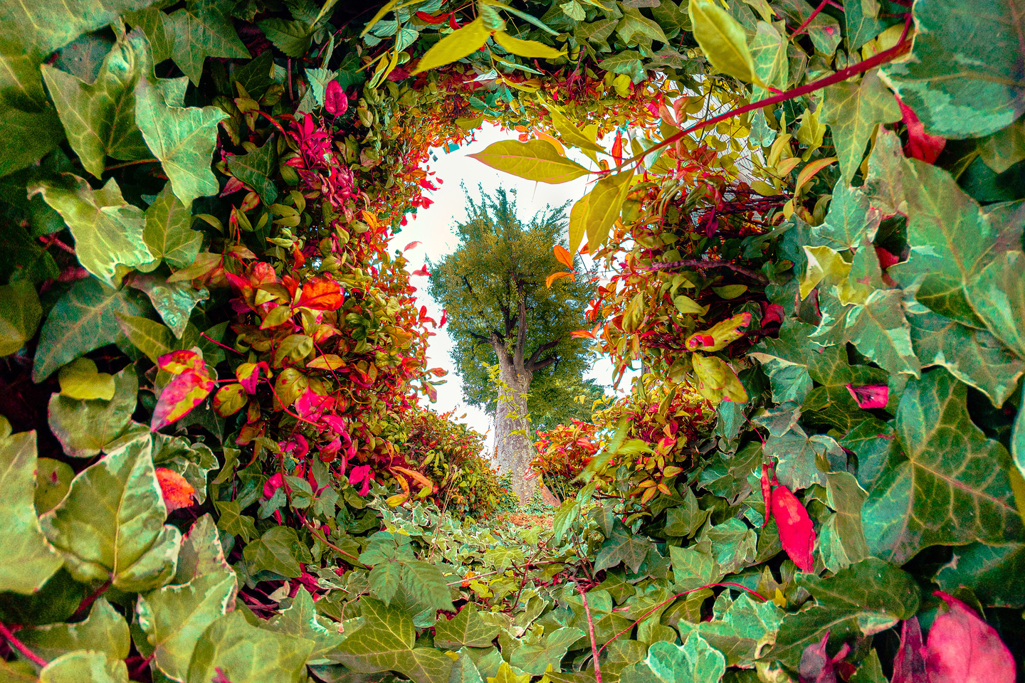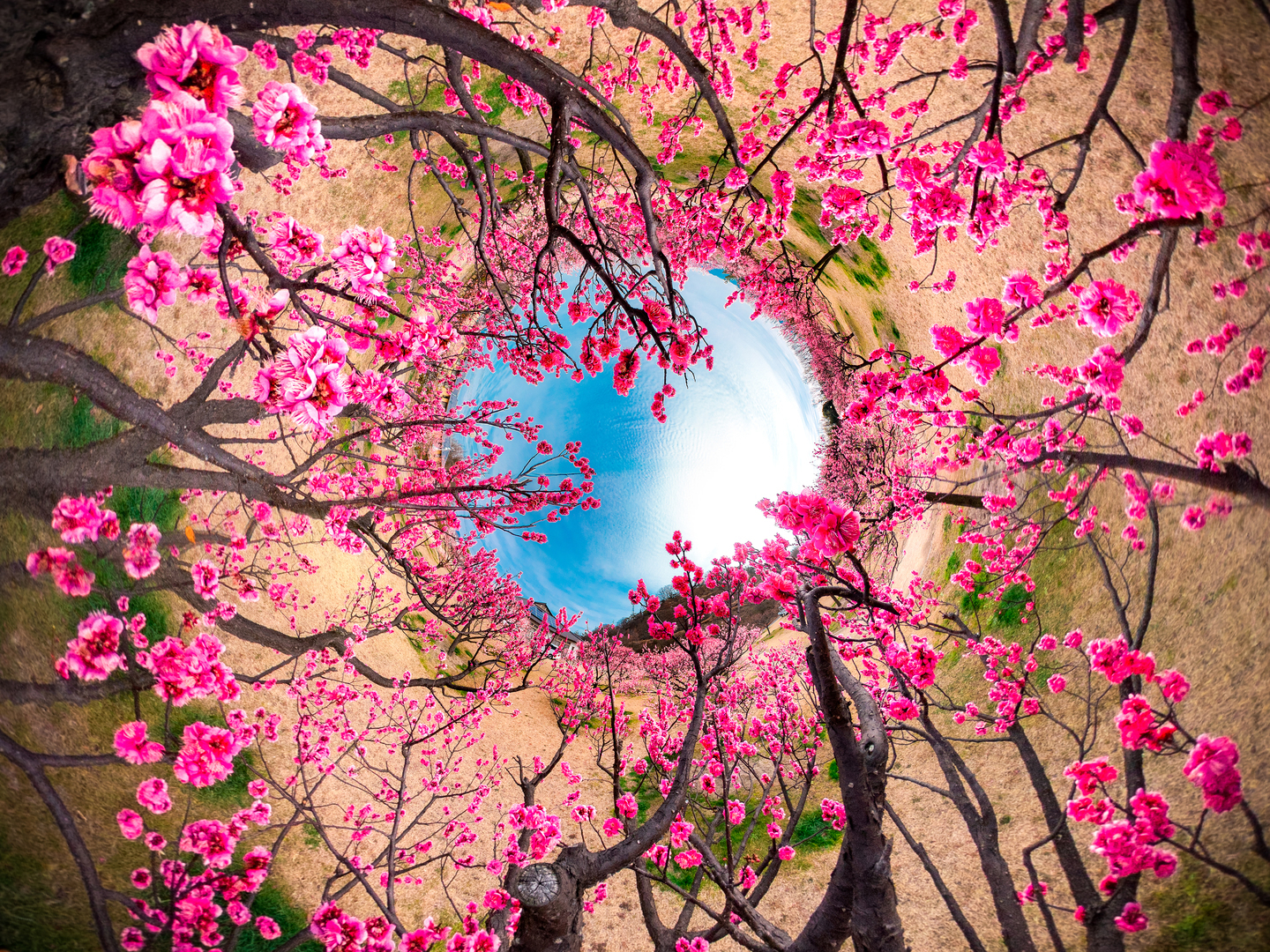 ■梅の花で花札をイメージして撮影。全天球カメラの撮影は試行錯誤の連続だ。ここから撮影するとどう写るのだろう…?初代から使っていて思ったことは人間目線を捨てることでより面白い表現が可能となること。虫の目線や鳥の目線、距離感や形がデフォルメされる全天球写真は写真に大切な要素である「偶然性」を楽しむにも丁度いい。