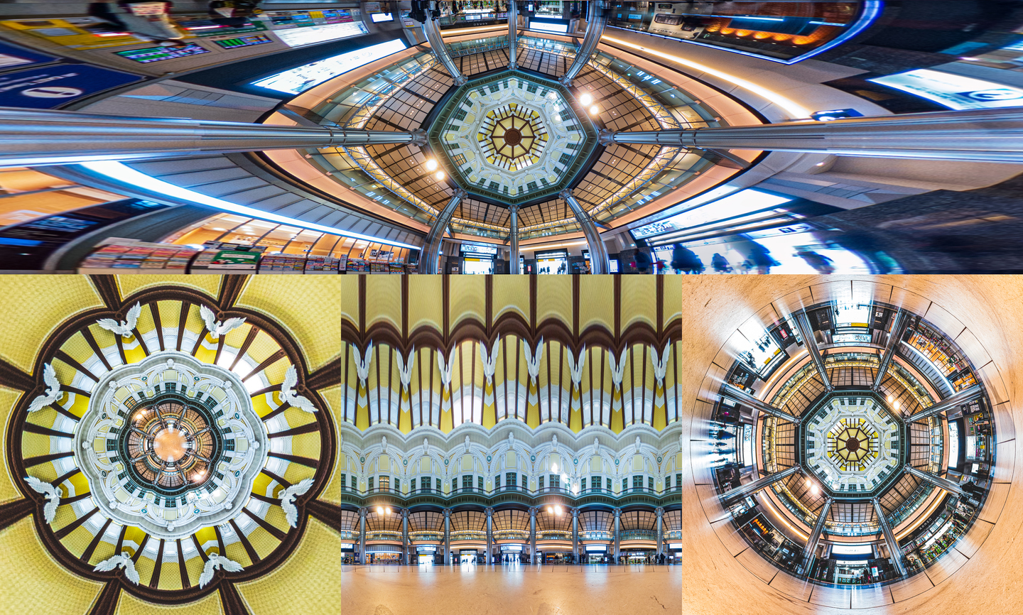 ■東京駅丸の内北口ドーム天井を撮影。一枚の全天球写真からそれぞれ見せ方を変えた4種類を生成し一枚に組み合わせた。「一枚の写真」で作った「組写真」となる。