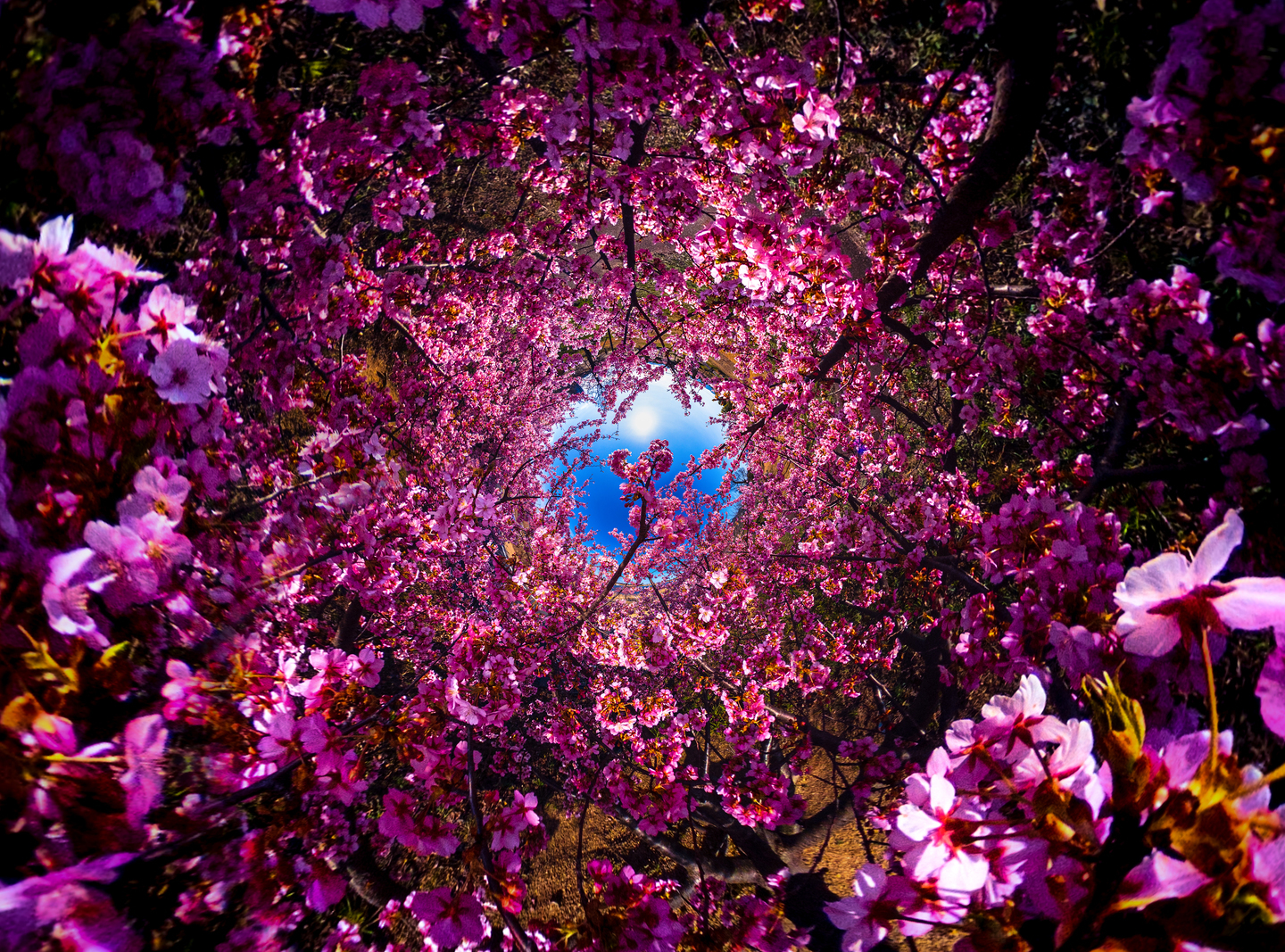 ■河津桜の中にRICOH THETA Z1を仕込んで撮影。2000万画素1インチセンサーと専用設計の高性能レンズの相乗効果による素晴らしい解像感で細かい桜のディティールを写し撮ってくれた。全てを写す全天球とはいえレンズ中央と周辺では解像感に差は出てしまうので特にメインになる部分はレンズ中央に配置するのかベストだ。