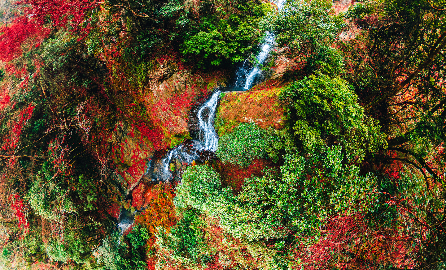 ■一脚を使ってハイアングルで滝を撮影した。撮影後に形状を変化させ滝を真俯瞰から撮影した様に見せている。木々や葉の解像感も素晴らしく積極的に風景を撮りたくなる。