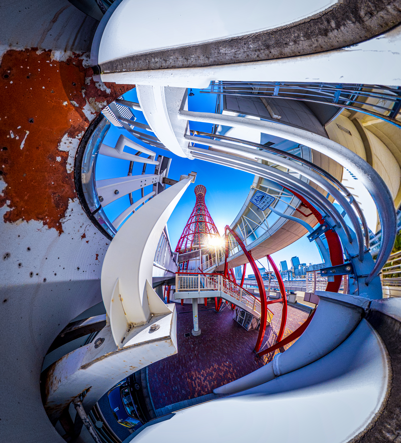 ■神戸ポートタワーを撮影。手すりにRICOH THETA Z1を固定してWi-Fiでリモート撮影した。アングル的にもポジション的にも通常のカメラでは絶対に撮影不可能な一枚に。サルバドール・ダリのシュルレアリスムな世界観を目指した。
