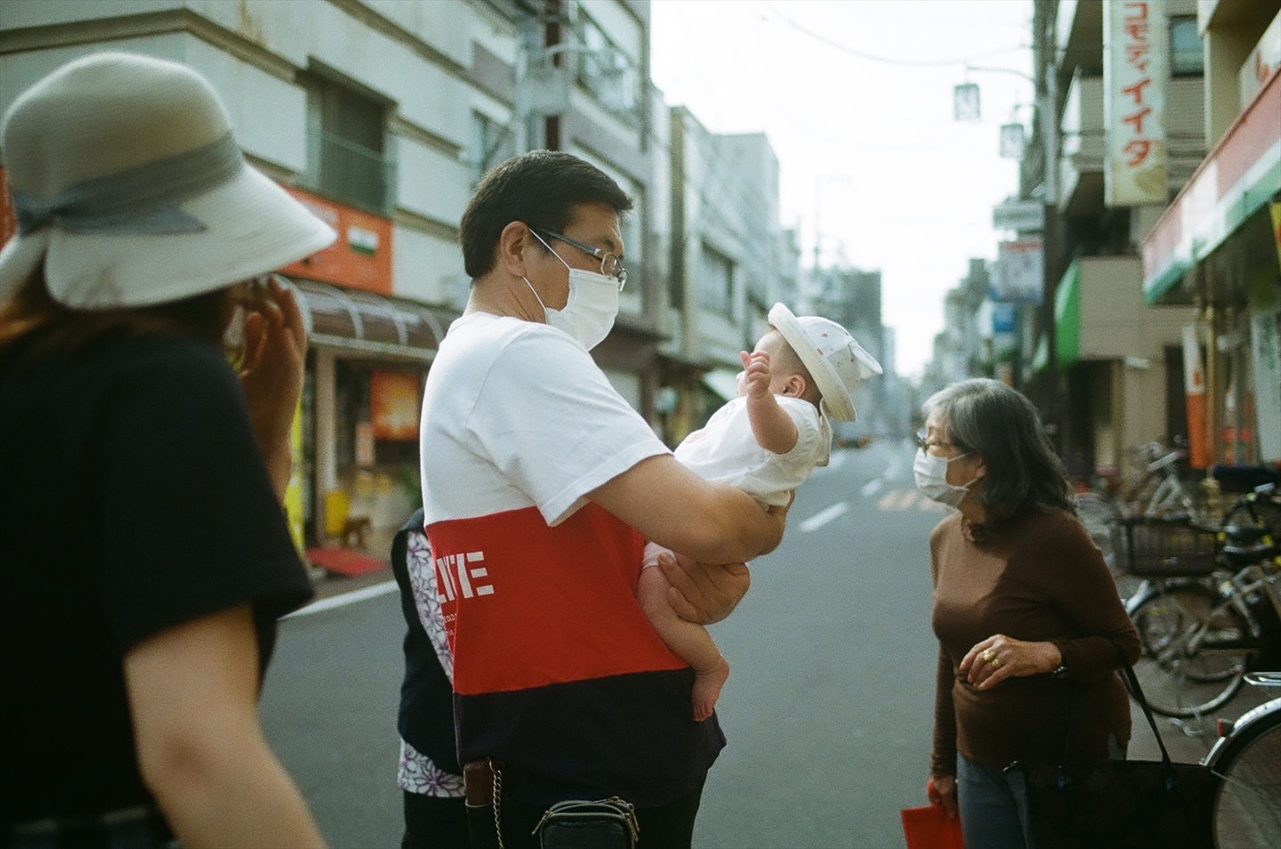 途中、老婦人に声をかけられて立ち止まったタイミングで、見守るように見つめた視線の先は、奥深い雰囲気が感じられる1枚に。コミュニケーションの温かさがフィルムの風合いによって伝わってきます。