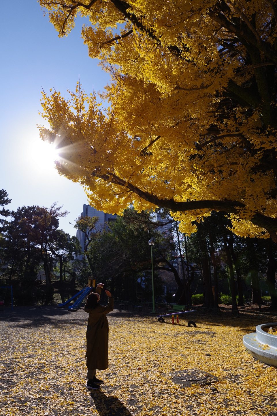 大きく見事な銀杏を撮影する女性の姿をスナップしました。フレームに太陽光が入っていますが、「HD PENTAX-D FA 21mmF2.4ED Limited DC WR」はしっかりと主要被写体を描ききりました。イヤなゴーストやフレアも認められません。銀杏の葉を1枚1枚解像しているのも分かります。