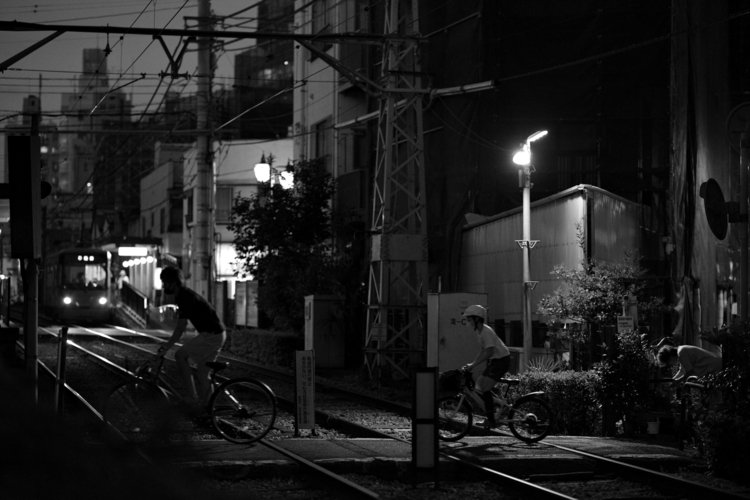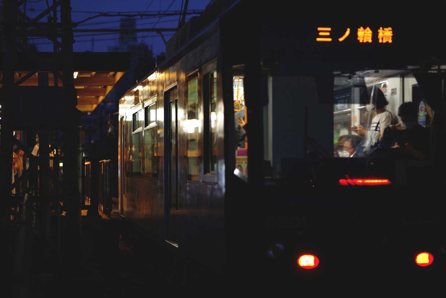 停留所に滑りこむ車両をAF-C(M)で連写して撮影。コントラストの強い光を浴びた車体を色収差もなく非常にシャープに捉えています。また、車内の様子までしっかり描写されました。車体に誇張されたパースがつかないので被写体に迫った臨場感が生まれるのも中望遠の良さです。歪曲収差ゼロの威力を感じさせます。薄暮の美しい青と、車体のツヤを強調するためにカスタムイメージはポップチューンをセレクト。