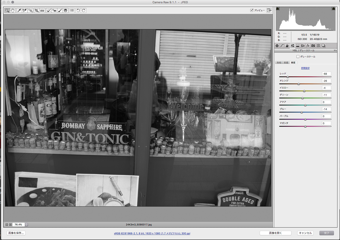 いきなりモノクロ愛全開で突っ走っていますが、そんなに敷居を高くするつもりはないのでお付き合いください。まずはデジタルの画像処理を使ったモノクロ変換の話を基本的な知識として解説します。解説で使ったのは、Photoshopの【カメラRAW】の【HSL/グレースケール】の【彩度・輝度】のタブです。まずは彩度を全ての色で-100にしてモノトーンに変換してから輝度を調節しています。