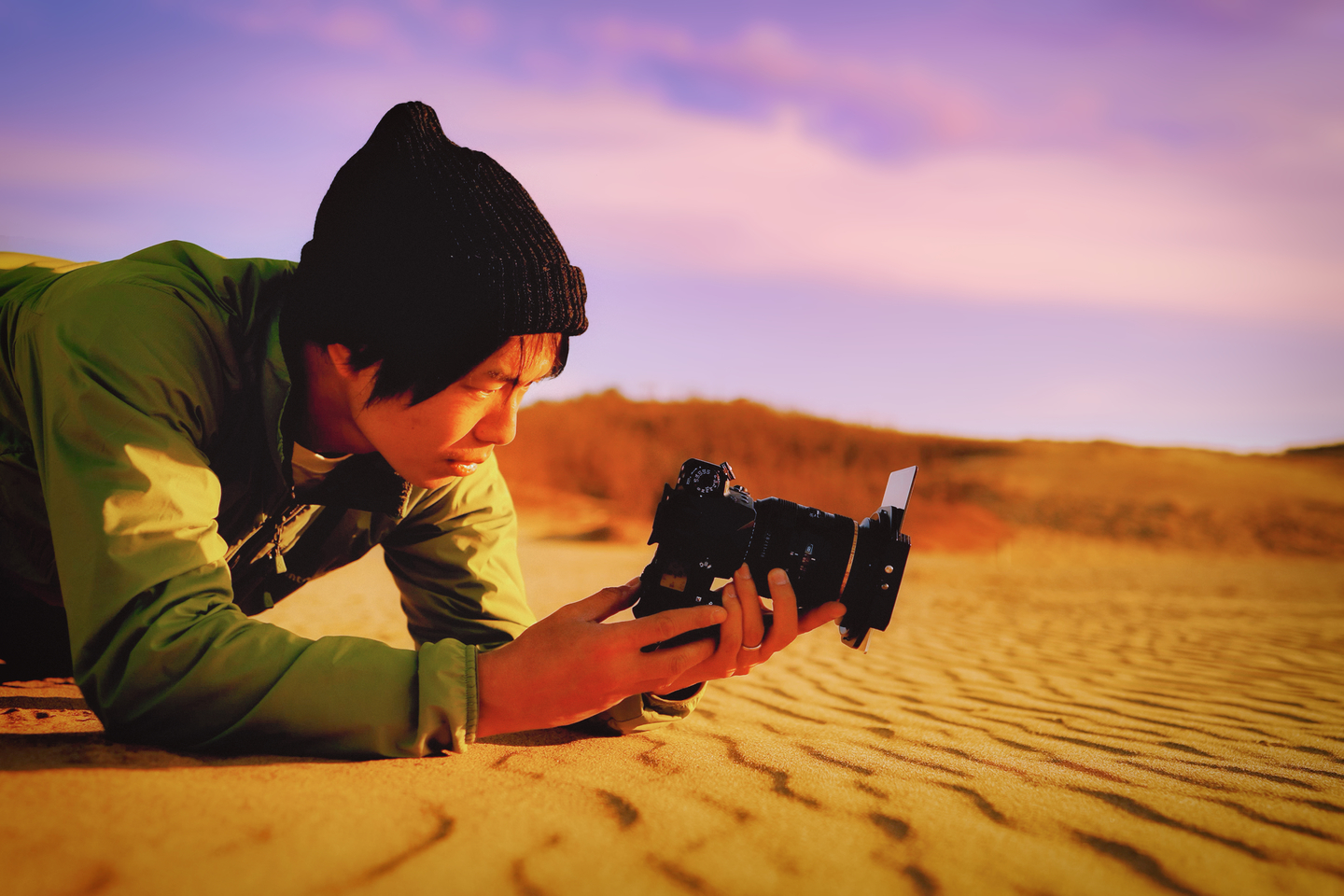 砂丘に這いつくばる様にして光学ファインダーを覗いて撮影した。陽が沈んで空が焼けたその光をしっかり目に焼き付けながらシャッターを切った。