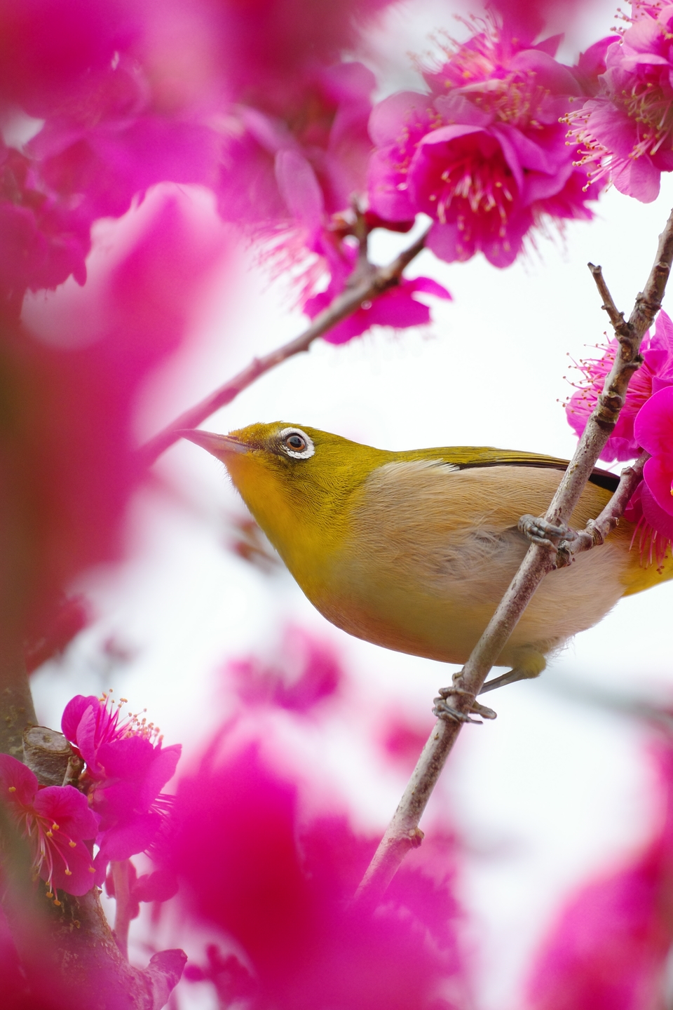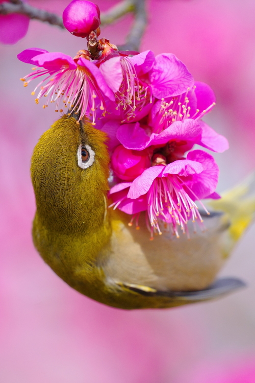 AF.Cでメジロを追いシャッターチャンスを狙った。手前に梅の花があってもメジロにピントをあわせ続けてくれたおかげでちょうどいいタイミングでピントがしっかり合った一枚を撮ることができた。