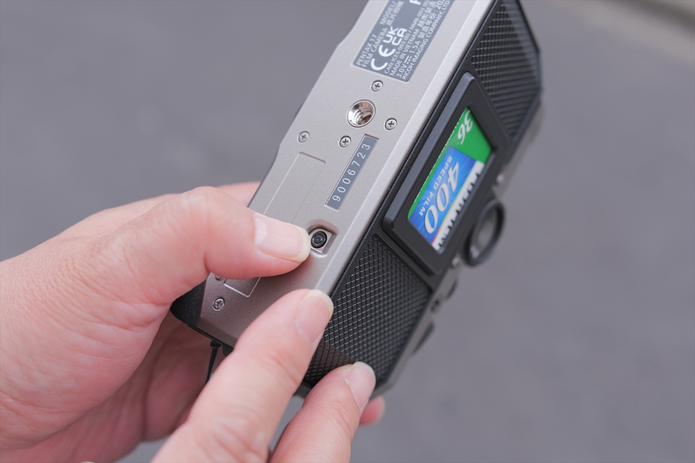 フィルム1本撮影が終わったら、フィルムを手動で巻き上げます。巻き上げ方法は、カメラの底面にある黒い小さなボタンを押して、クランプレバーをくるくると回し、フッと手元が軽くなったら巻き上げ完了。