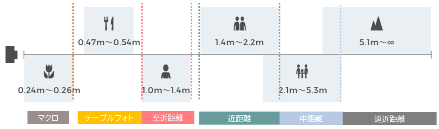 フォーカスリングにマクロ(最短撮影距離25cm)から遠距離までのアイコンが表示されており、撮影したい被写体までの距離に応じ、アイコンを自身でセレクトする。というピント合わせの「ゾーンフォーカス(目測)」方式です。