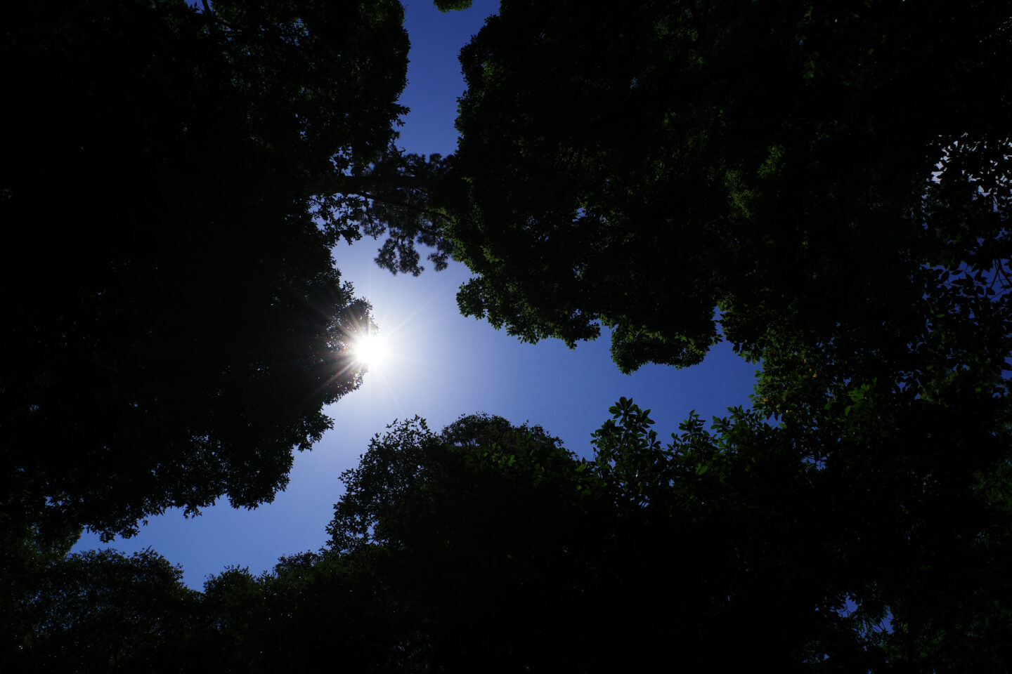 深い森から空を見上げてみました。まるで深い渓谷を覗いているかのようなシーンにも見えますね。太陽を入れてよりアンダー目になるようにシャッターを切ったことによって一瞬銀河のような印象も受けます。このカスタムイメージ、面白いですね!