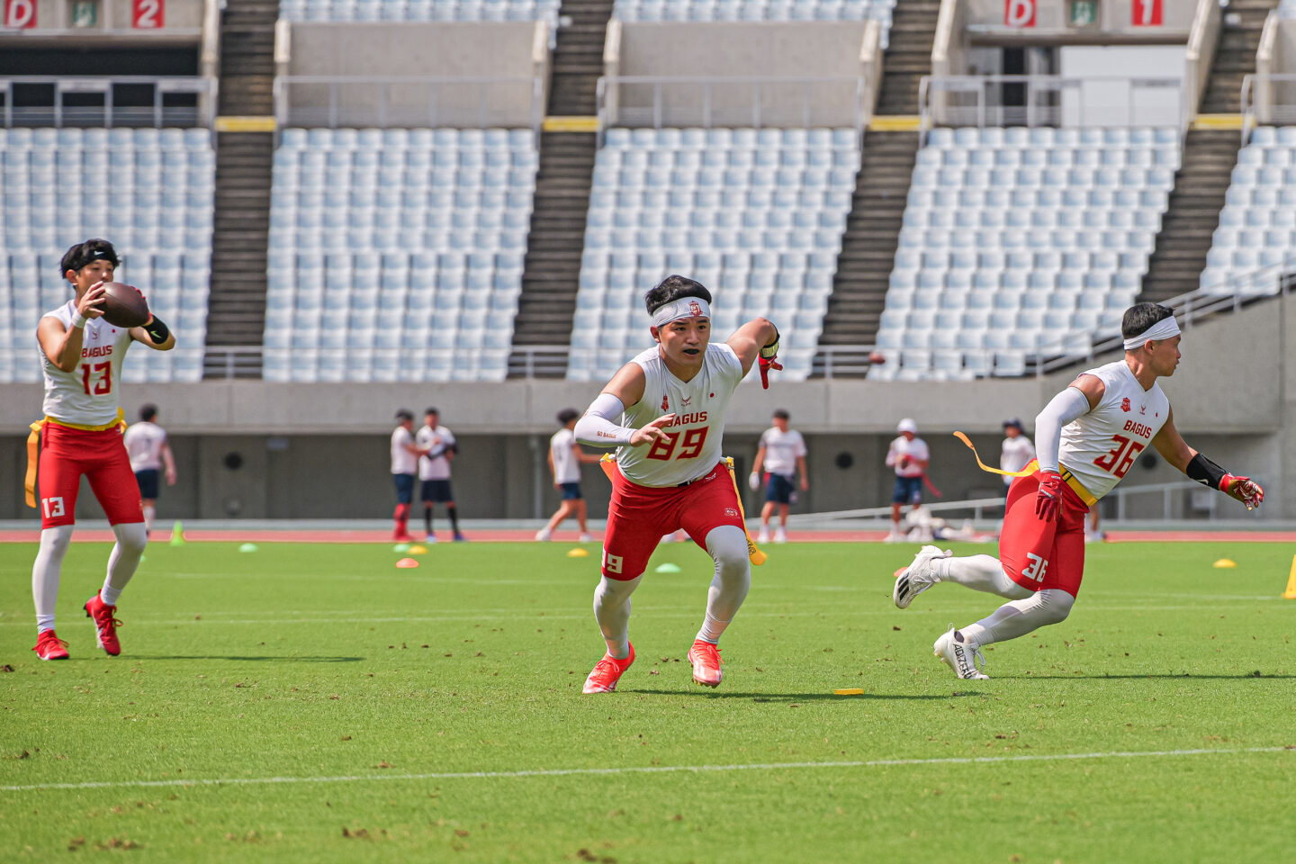 ここからは、2028LAオリンピック競技に決定しているフラッグフットボールを、フラッグフットボール実行委員会関西のご協力を得て撮影させていただきました。大阪の長居スタジアムで行われました試合の写真でお話しさせていただきます。