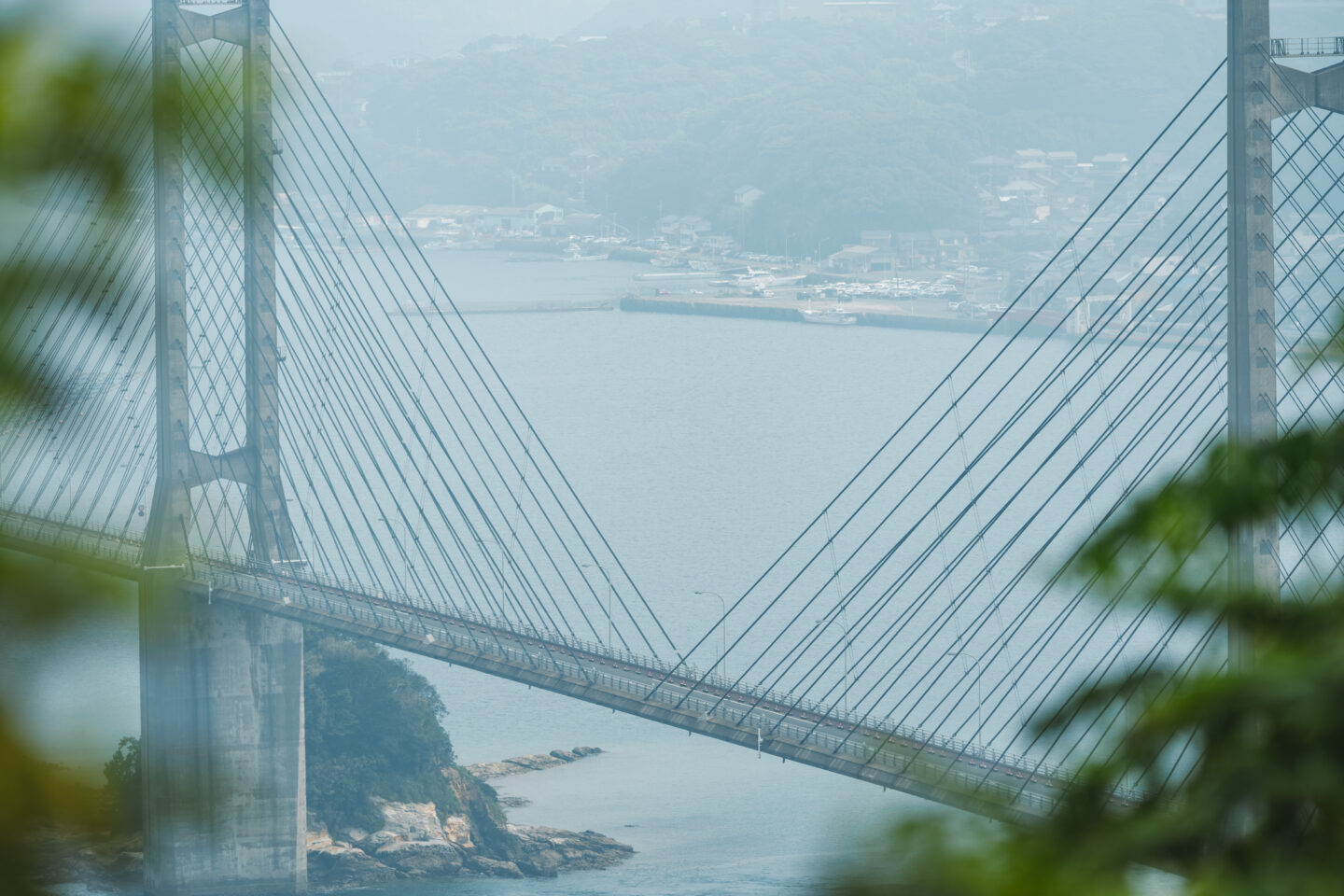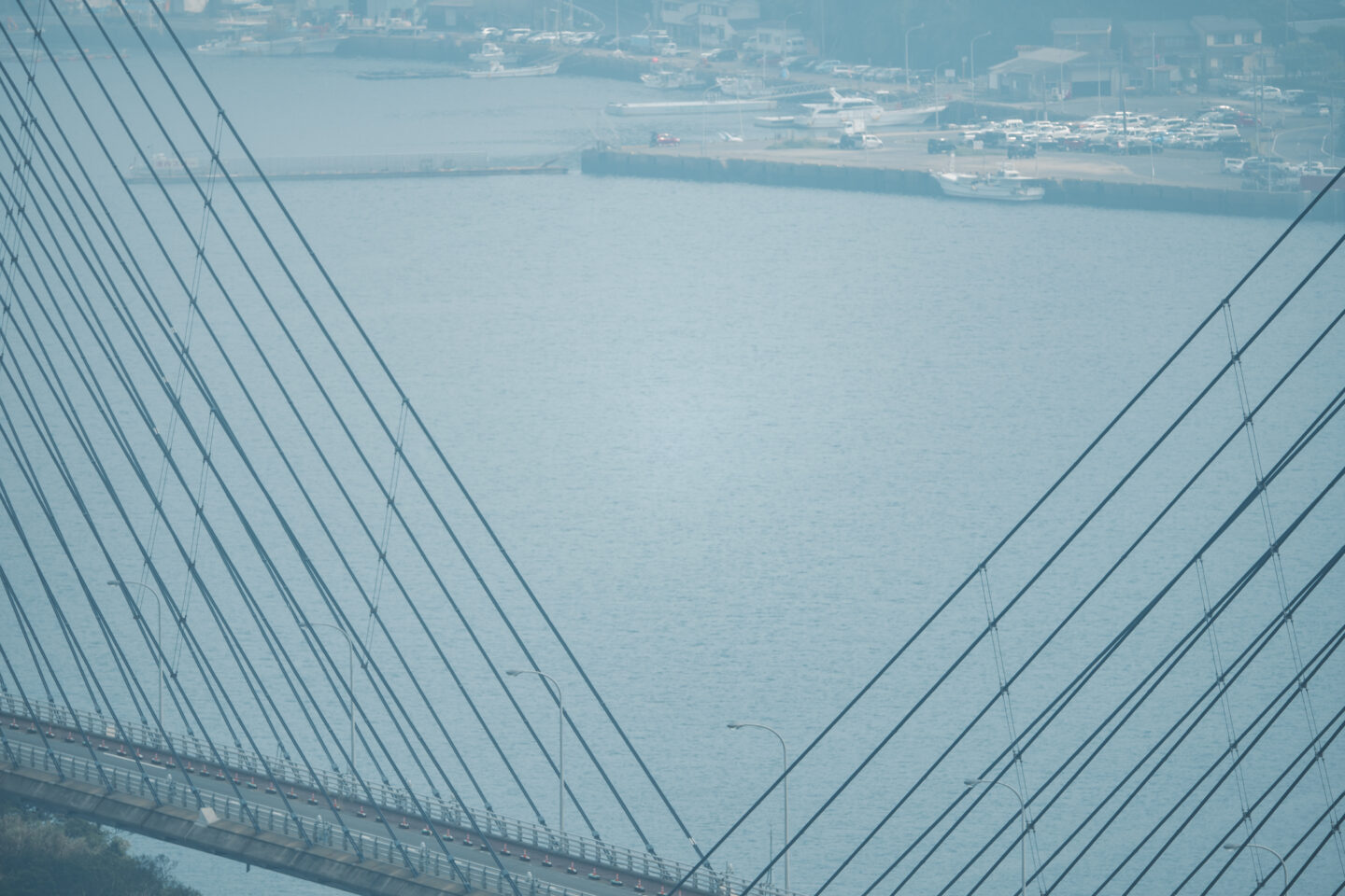曇り時々晴れとすっきりしない天気だったが、まずは橋を撮影する。強めの風にあおられた雲が海側からこちらへ流れてくる。霞がかったように見える景色は個人的に好みで、淡いトーンと緻密な描写のギャップが楽しい。実際の見た目よりも、鮮明に描写されている。このレンズの解像感とコントラストの高さがわかる。斜めに張られた、何本ものケーブルが重なり合った部分も、非常に繊細に描写している。 直線の連なる細かい部分からも、このレンズの画質の高さを感じる。