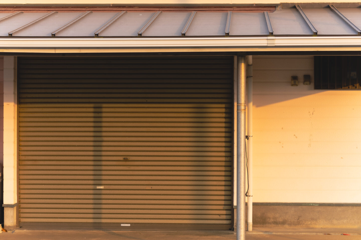 夕日に照らされる物置小屋。望遠レンズでありがちな糸巻き型の歪曲収差もなく、閉じたシャッターのボーダーラインと外柱の影が直角に交差する。
