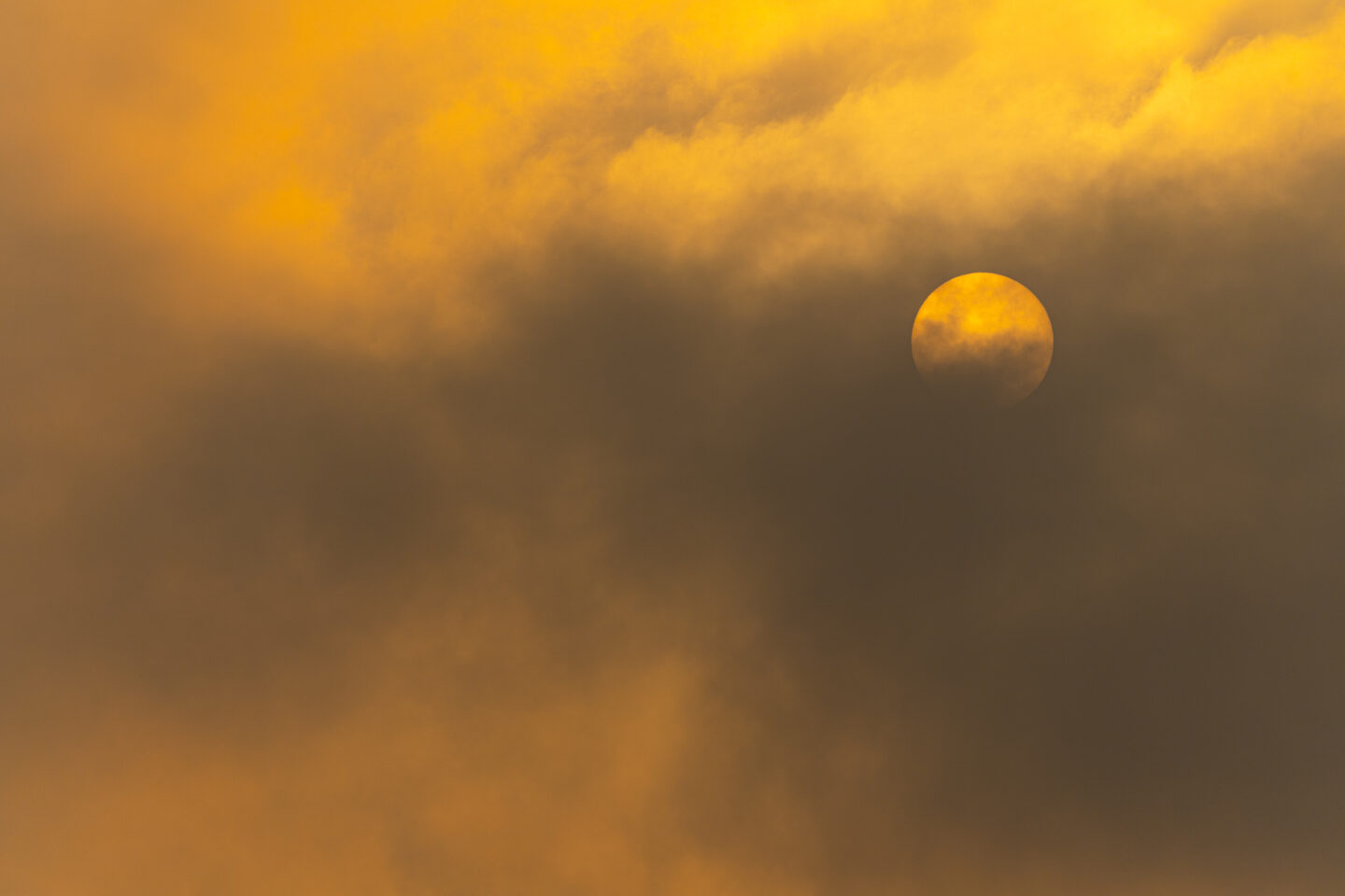 400mmで見る夕陽。濃い雲に覆われる直前に、慌てて手持ちで撮影した。太陽がこんなにも近く撮れる。黄金色の夕日にかかる灰色の雲が印象的だ。