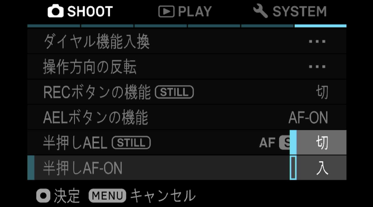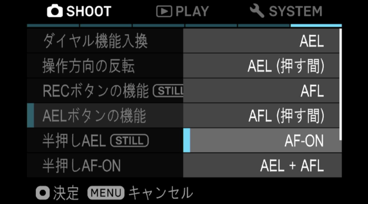 多くのカメラがそうであるように、fpでも初期設定ではシャッターボタン半押しと同時にAFがスタートする設定になっている。通常はこの設定のままでも良いのだが、ポートレート撮影の際には人物の表情や仕草のシャッターチャンスを優先するべく、シャッターボタンとAFスタートを切り分けて行いたい場合もある。その場合はまずメニュー内[SHOOT -半押しAF-ON-切]にしてシャッターボタンからAFスタート機能を省いた後に、同じく[SHOOT -AELボタンの機能-AF-ON]に設定すると、カメラをグリップした際に右手親指の位置となるAFLボタンにAFスタート機能を割り当てることができる。