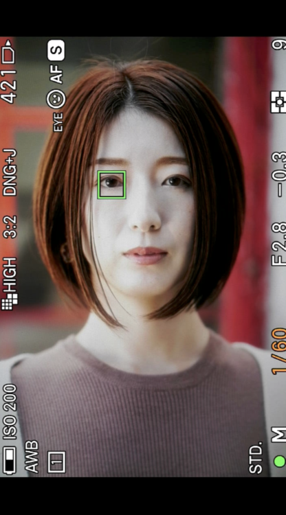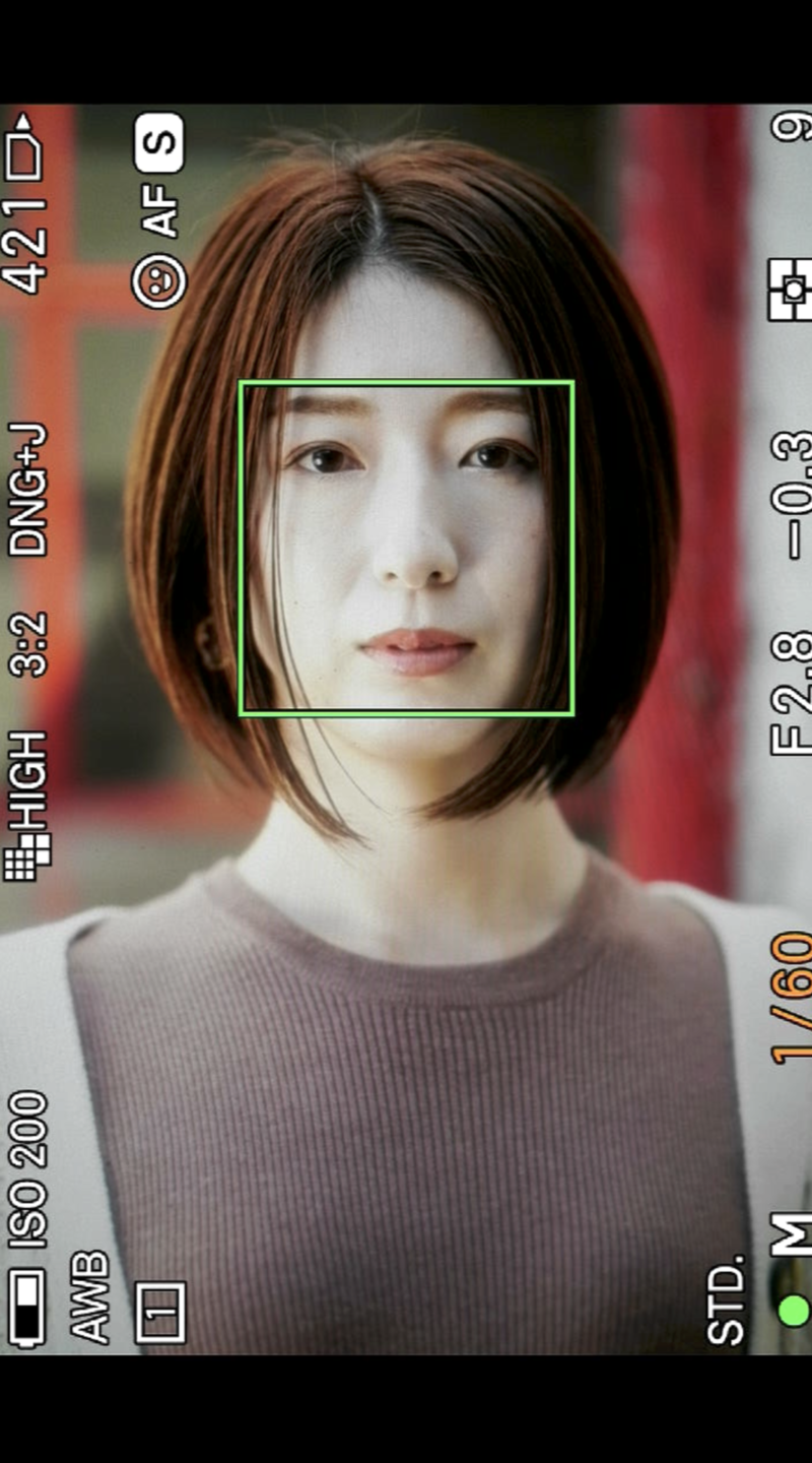 廊下の壁面の窓から入る外光のみで撮影。光と影の流れ方を見ながらモデルに立つ位置を指示。顔/瞳認識AFを使用して目元にピントを合わせて撮影した。fpが人物の顔/瞳を認識するとAF枠がオレンジ色に変化するので、それを確認したうえでAELボタンを押しAFをスタートさせて、AF枠が緑色に変化した瞬間にシャッターボタンを押す。これを繰り返すことで浅い被写界深度であってもピント位置がずれてしまう頻度を下げることができた。