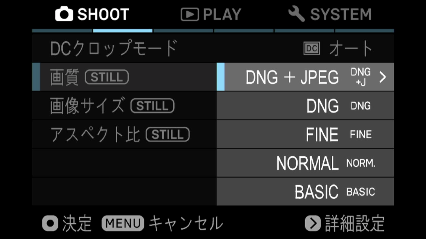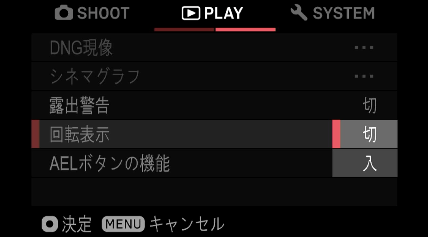 ポートレート撮影に限らず縦位置撮影の画像を再生した場合、初期設定では自動的に縦画像としてモニターに表示される。そこでメニュー内[PLAY -回転表示]で[切]を選ぶことで自動回転されなくなる。カメラを90度回転させる必要はあるが、縦位置画像でもモニター全面に画像が大きく表示されるので確認しやすくなる。