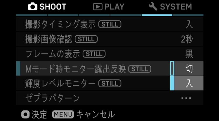 マニュアルモードでのフラッシュ撮影の際に、フラッシュ光の露出設定絞りがその場の明るさより暗い設定値になっていると、モニターに露出反映させる設定のままでは被写体が暗く表示されてしまうことがある。その場合はメニュー内[SHOOT -Mモード時露出反映(STILL)]で[切]を選ぶことで被写体を明るく表示させることができる。これなら構図の確認も容易に行える。