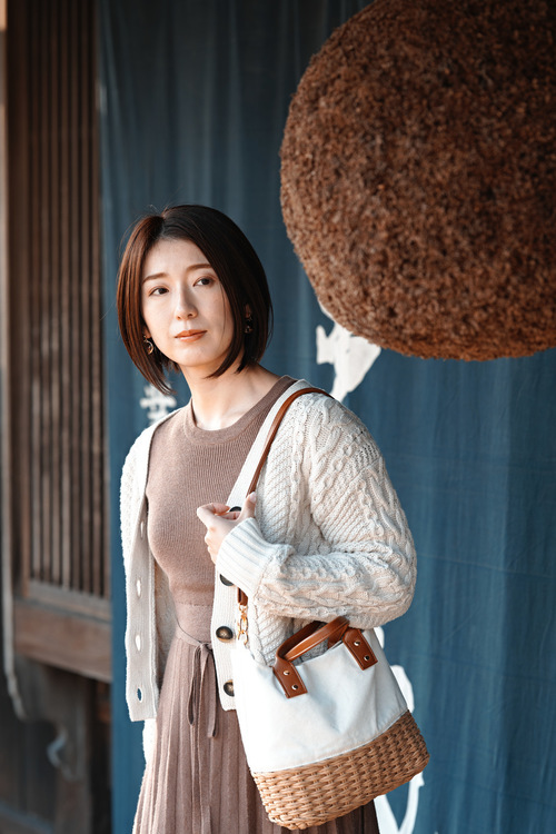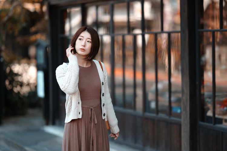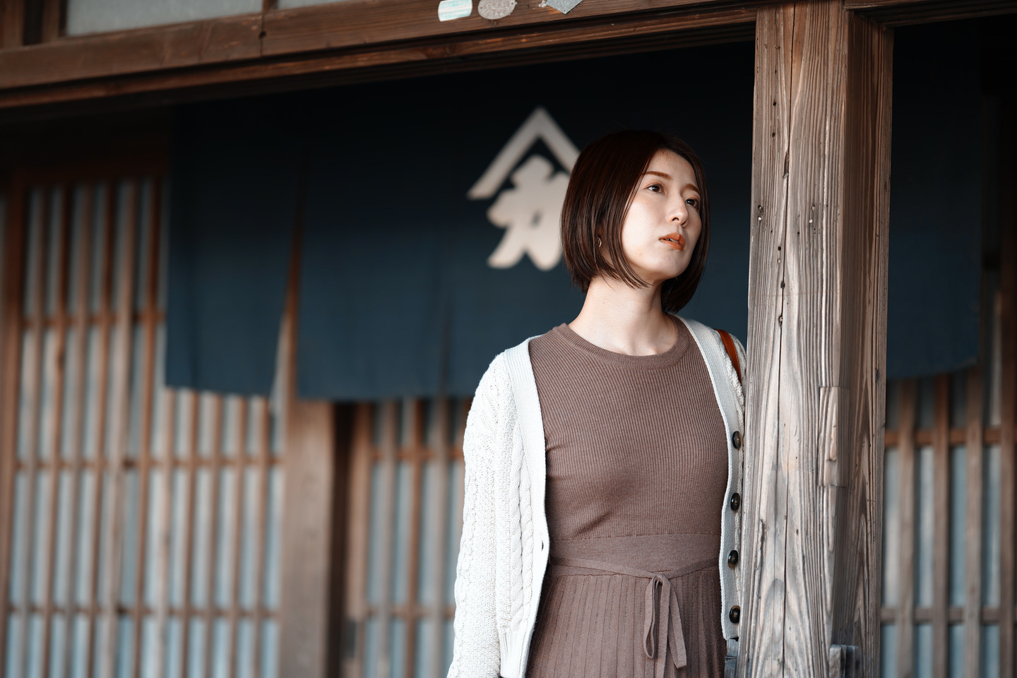 古い家屋が残る街並みを散策しながらの撮影。105mm F1.4 DG HSM | Artの柔らかなぼけ味にカラーモードのティール&オレンジを重ねることで、木造りの和風家屋を背景に温かみと懐かしさを感じる風情に仕上げた。このティール&オレンジはさまざまなシチュエーションで独特な効果を生み出してくれる面白いカラーモードだ。