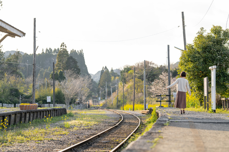 ローカル線のホームにて列車の到着を待つ間の一コマ。夕方になり傾いた日差しに輝くレールとホームを歩く女性の後ろ姿にピントを合わせた。インフォーカスの解像感の高さと、手前から奥にいくにつれ遷移するアウトフォーカスのなだらかなグラデーションがとても美しい。