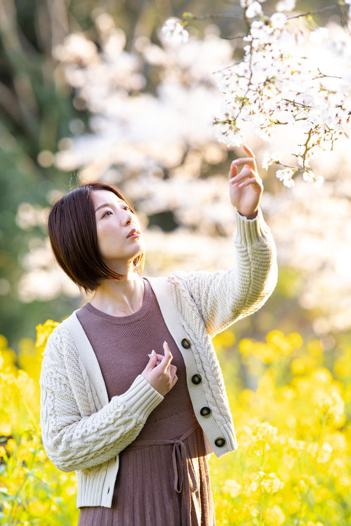 夕方の里山を包む柔らかな春の光の下、桜と菜の花を背景にして撮影。人物と桜の枝はクリアに描きだしつつも、背景の桜と菜の花は色とシルエットが溶け込みすぎないようにするため、絞り値をF2.0に設定してぼけ方をコントロールした。高い解像力と柔らかく美しいぼけ味が融合した、fpと105mm F1.4 DG HSM | Artの組み合わせならではの一枚となった。