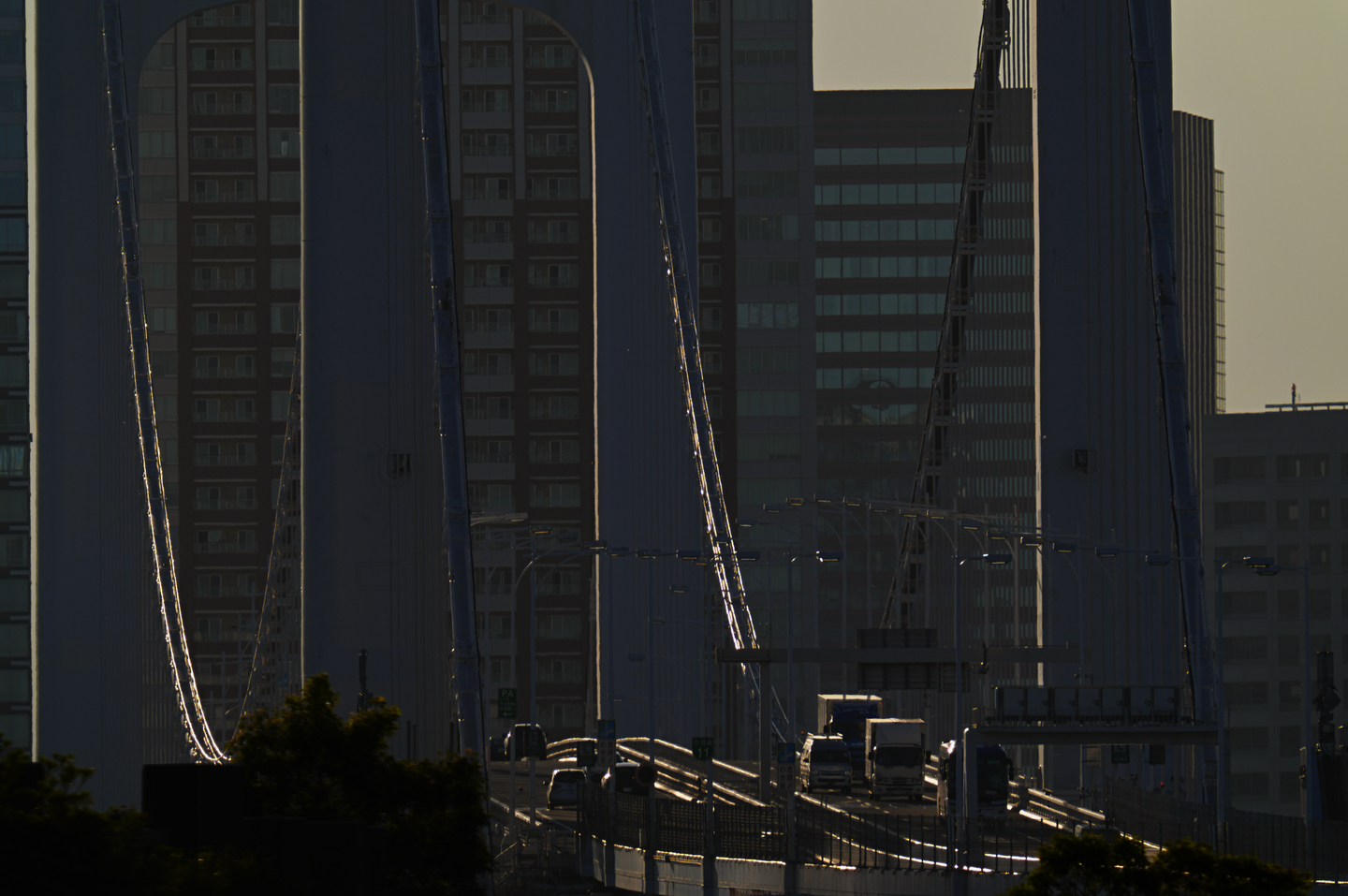 Lマウント用の2倍テレコンバーター「TC-2011」を使用して1200mmで撮影しました。夕陽を浴びてレインボーブリッジを渡る車両をドラマチックにキャプチャーできました。最大1200mmという「眼」は撮影領域を格段に広げてくれますね。
