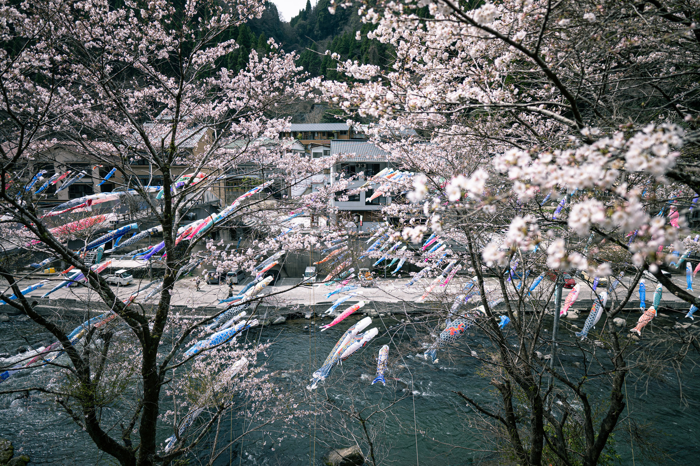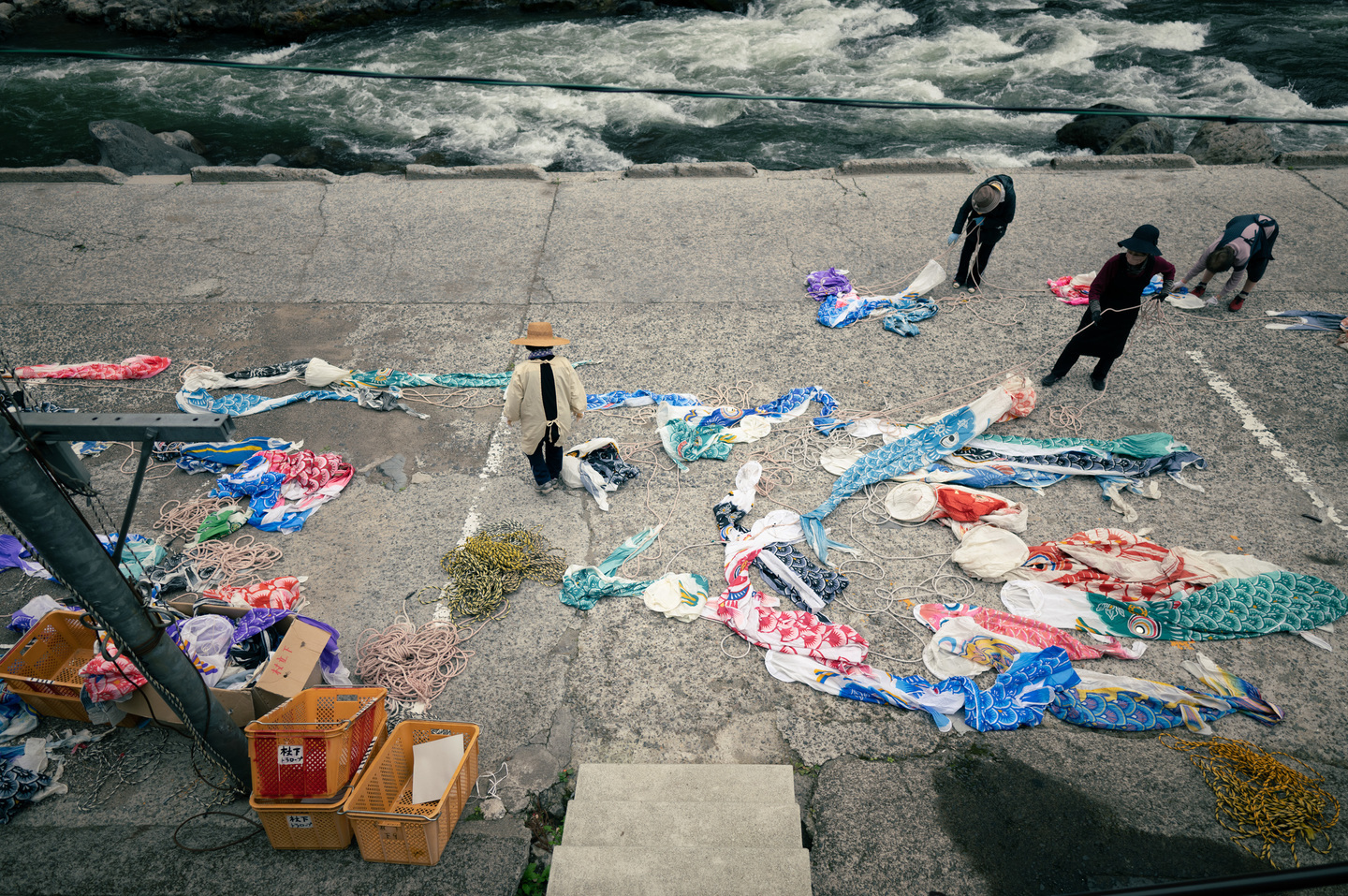春には、3500旒の鯉のぼりが杖立川を泳ぐように飾られる有名な場所でもある。この日は鯉のぼりをあげる日で、地元の方々や学生さん達がこの見事なアートを仕上げる様子も撮影できた。