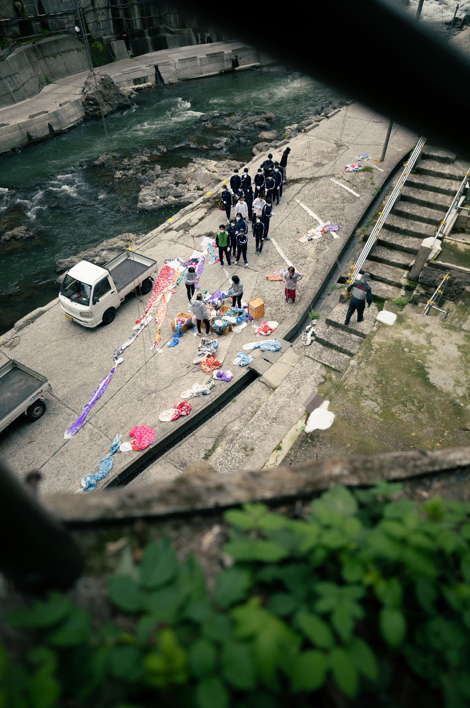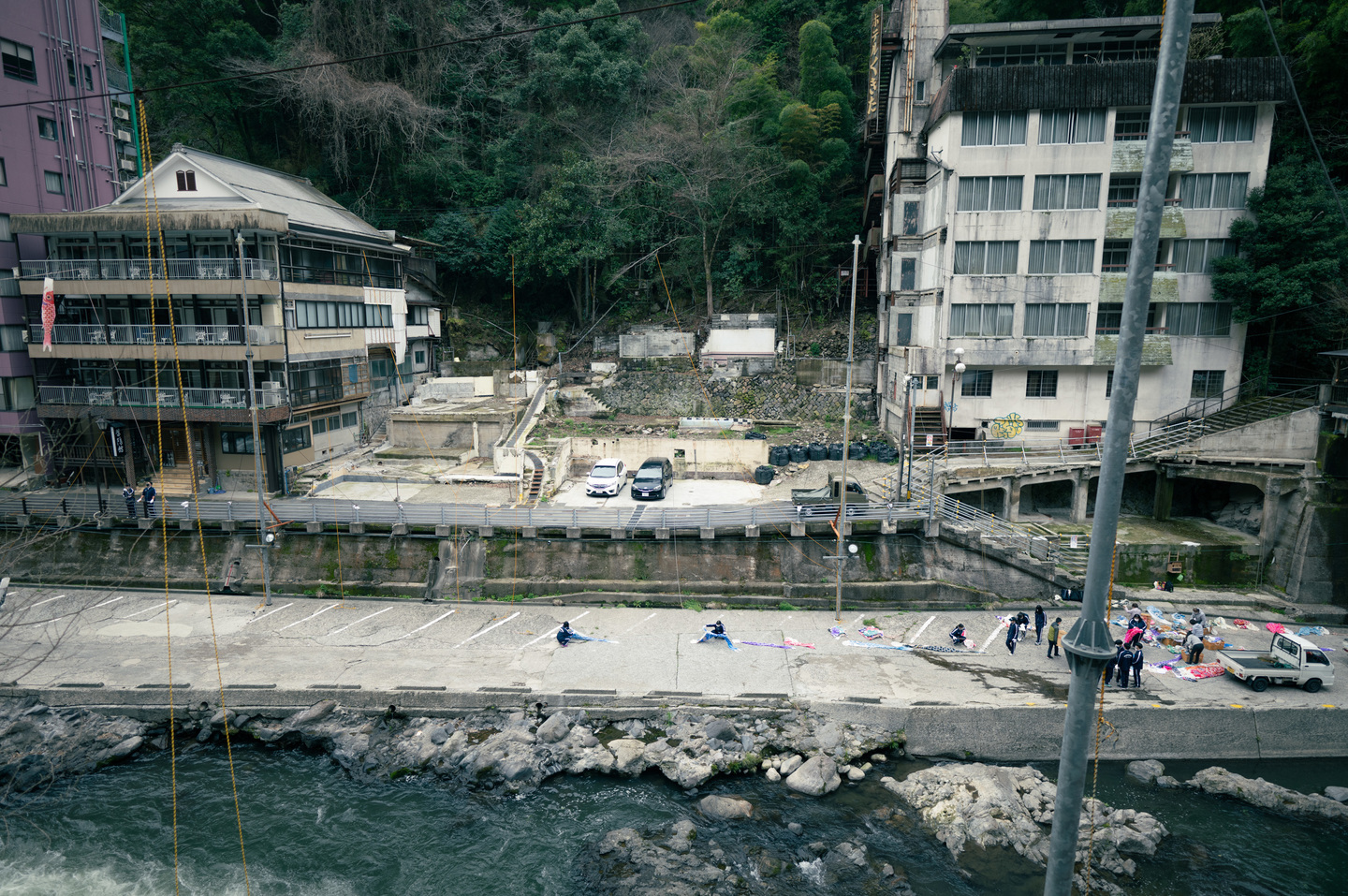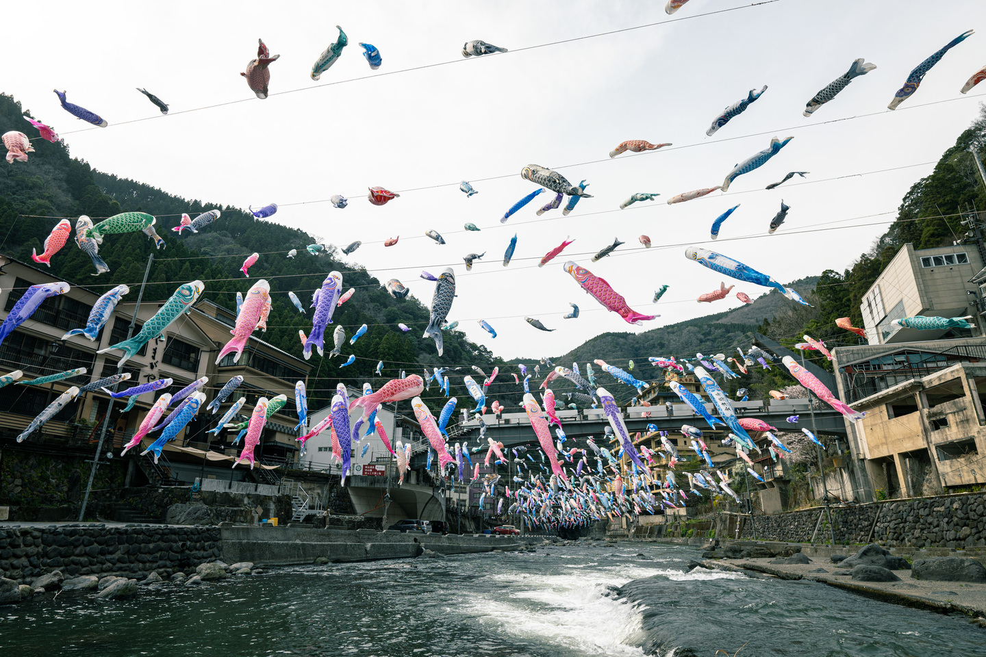 2020年7月、激しい豪雨の影響でこの街の中心を流れる杖立川が氾濫し、歴史ある旅館や商店や家屋が大きな被害を受けた。写真中央の敷地には元々風情のある建物があった。水嵩がこんなにも高いところまで上がったことや、土砂や瓦礫に覆われていた当時の状況を思うと心が痛い。今は整備が進み少しずつ修復されている。苦難にも負けず、この地へ少しでも多くの人々が足を運んでくれるように、懸命に鯉のぼりを飾る様子が感動的だった。