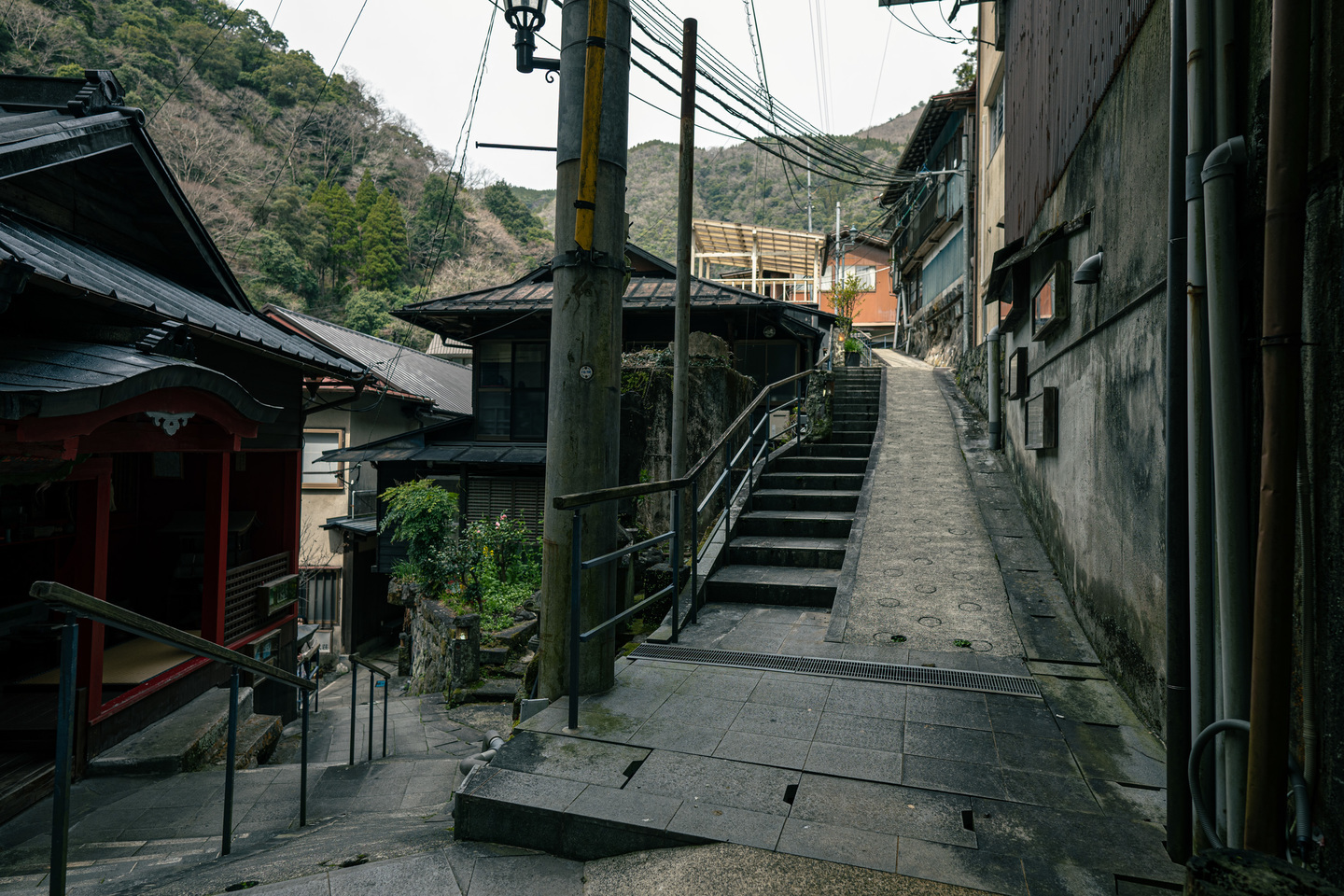 街の所々にある路地に入ると、細い坂道が続く。「背戸屋」と呼ばれ、古くから増改築を繰り返して出来上がった。とても風情のある通りである。この背戸屋を散策する時にも、94.5度の広い画角がとてもフィットする。坂の下から手前で折り返し、さらにその先へと続く様子を、1枚の写真に収めることができた。絞り解放からとてもシャープな描写をするレンズだが、少し絞って撮るとさらに解像感が増す。