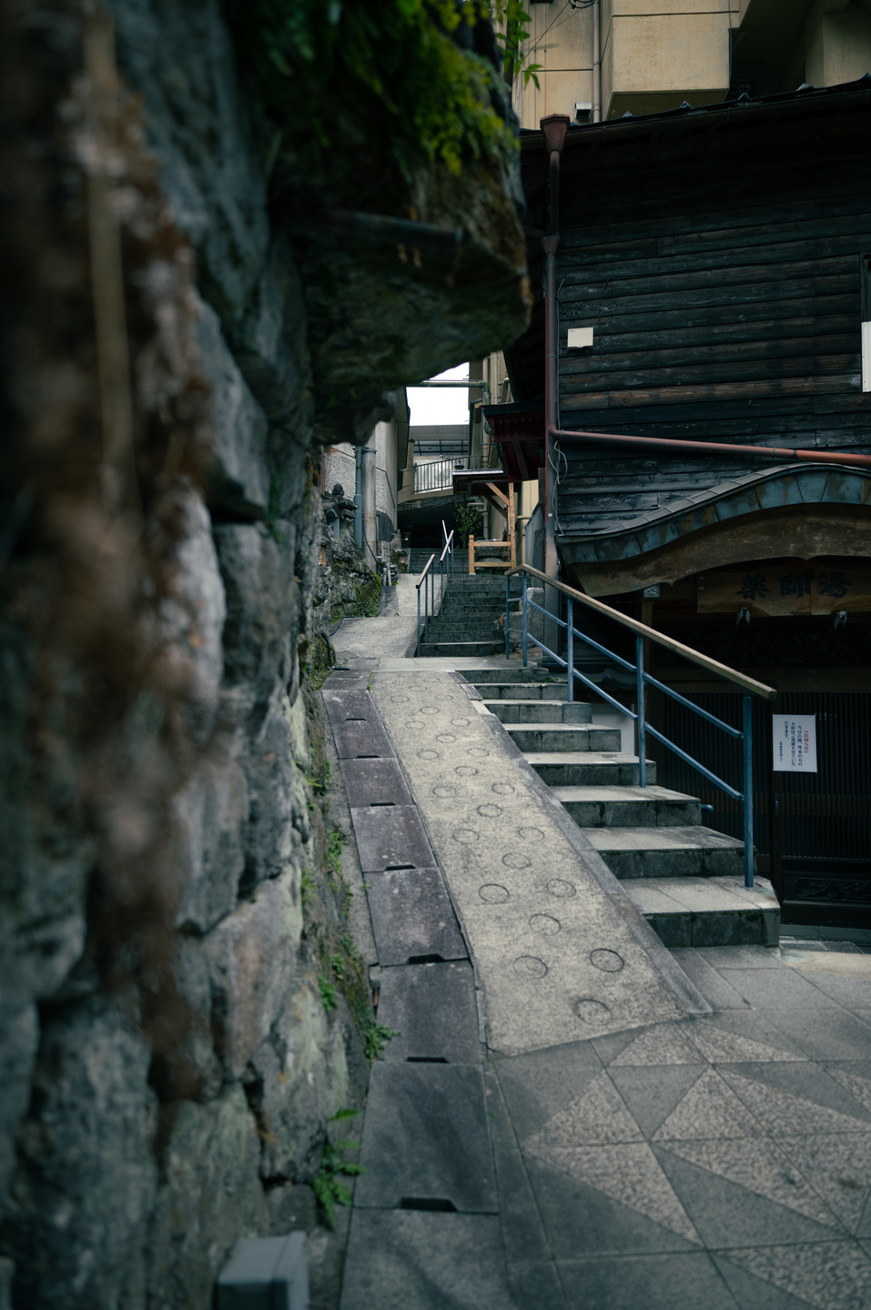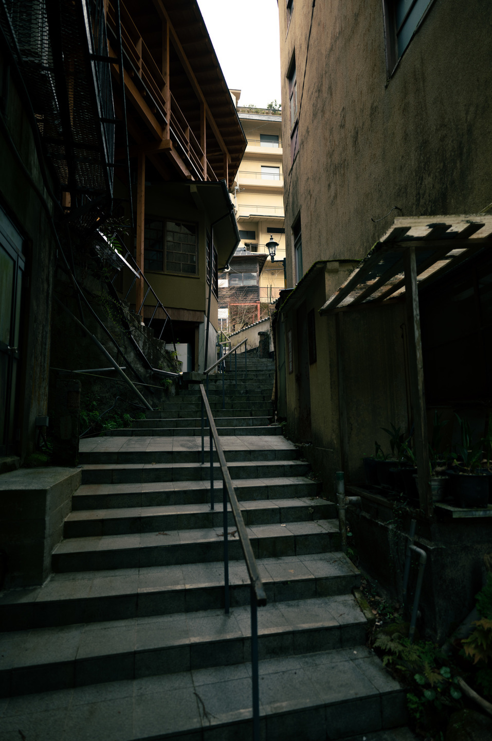 勾配のついた細く長く続く複雑に入り組んだ細道を、建物の隙間から照らす曇り空の柔らかい光。どこからともなく微かに聞こえるJazzが昭和の時代にタイムスリップしたかのように錯覚する。