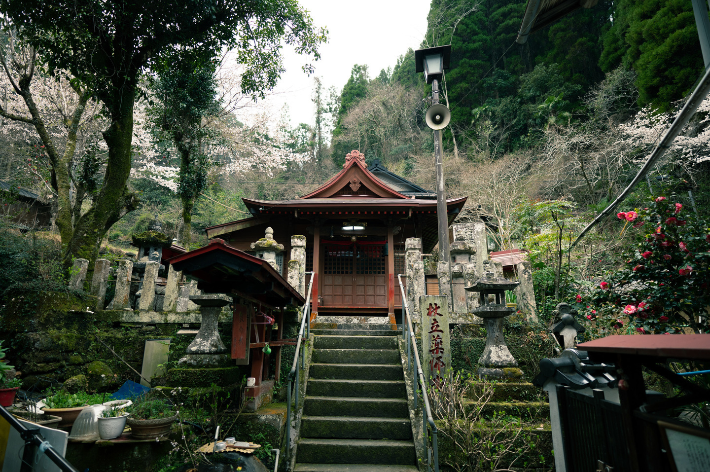 背戸屋を抜けた先にある杖立薬師堂。椿と七分咲きの桜が、ほんの少し肌寒い心地の良い温度まで伝えてくれる。