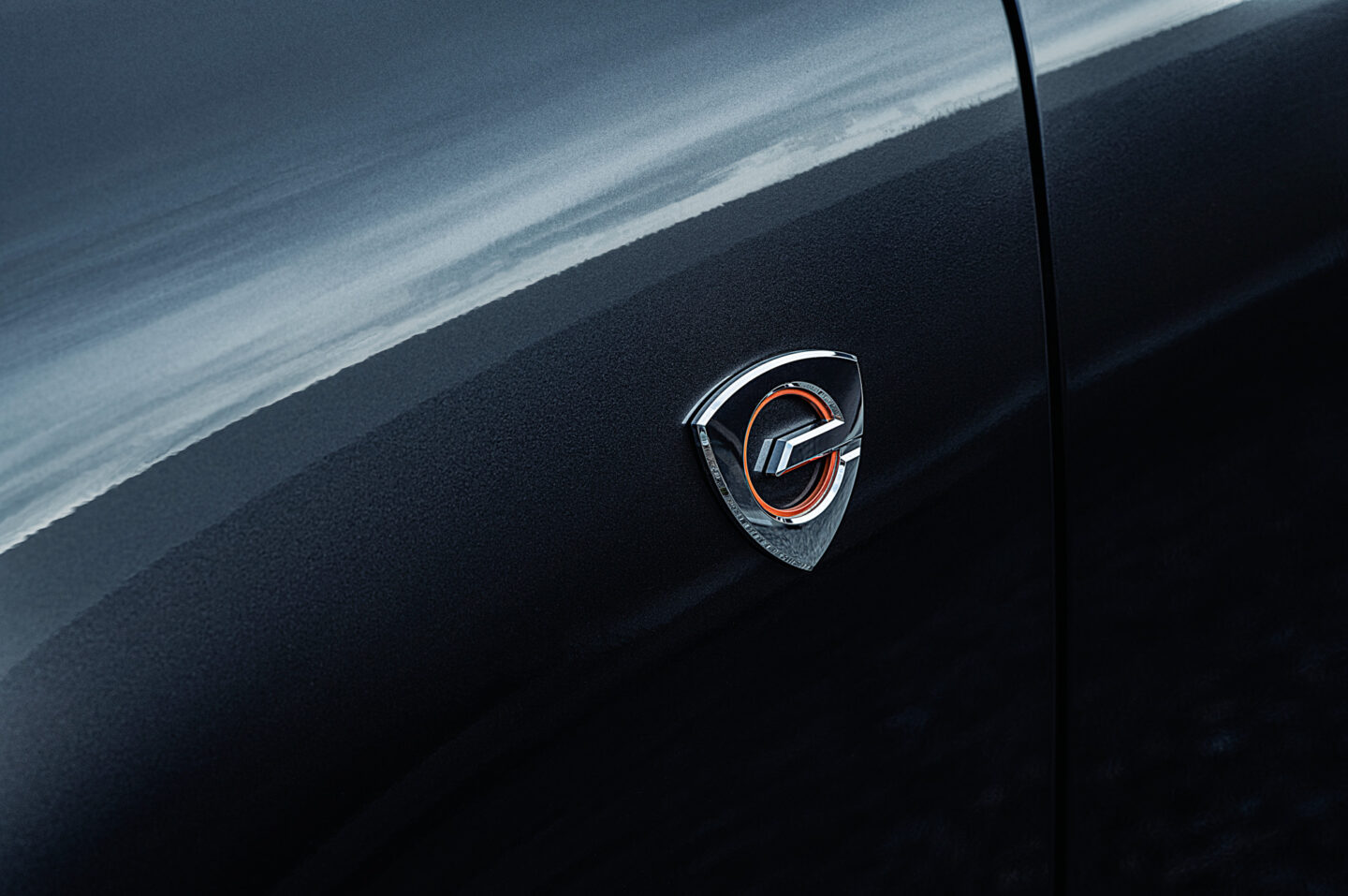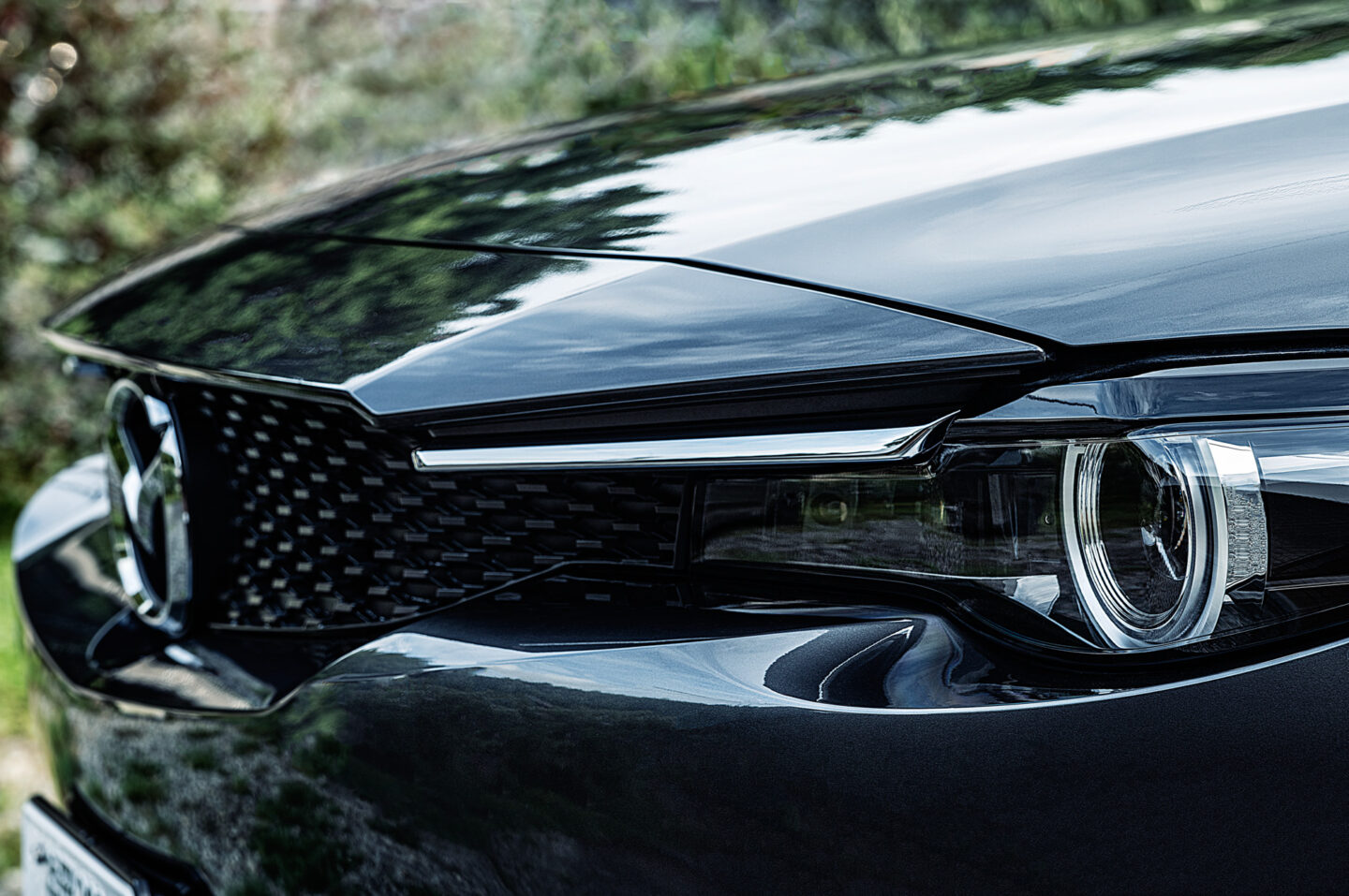 自動車を撮影してみた。MAZDA MX-30、先進的なデザインの美しい車である。ボディーの艶やかさと、複雑なプレスラインのシャープさを見事に描写している。