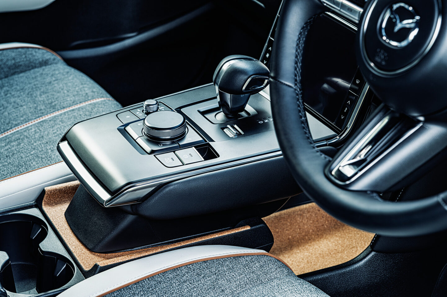 自動車のインテリアにはさまざまな素材が使われている。レザー・ファブリック・金属・メッキやプラスティックなど異なる質感が調和するラグジュアリーな空間。ハンドルやシフトレバーやコンソールボックスなど複雑な形状に多くの素材が混在し、表現が難しい被写体だが、立体的で高級な質感を見事に描写している。