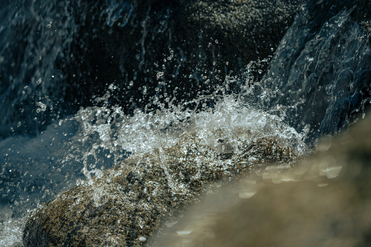 さらに、落ちた水が岩に当たり弾ける様を高速シャッターで撮影する。(写真下)