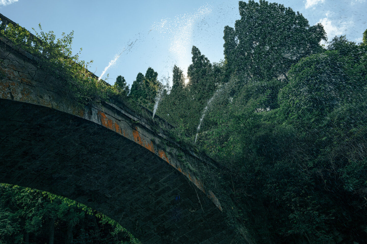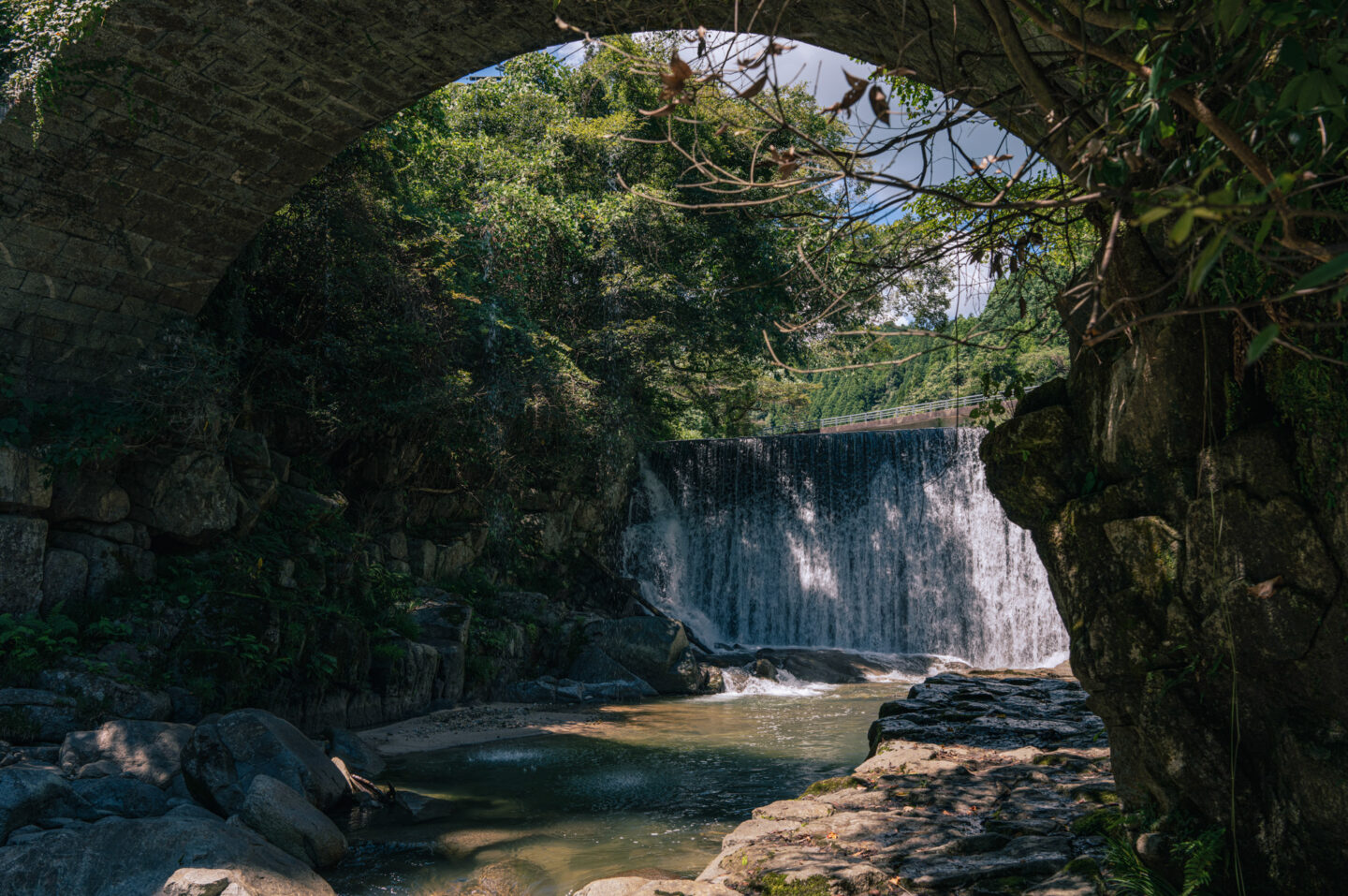 橋の下へと降りた。アーチ橋をフレームにして滝を撮影する。抜けの空が飛ばないよう露出アンダーで撮影した。後にRAW現像処理で、橋の裏側や岩などのシャドー部分を持ち上げたが、ディテールを失うことなく捉えている。