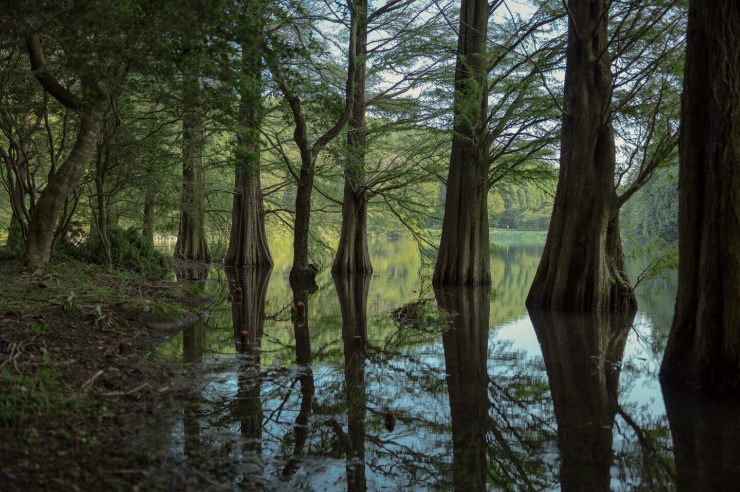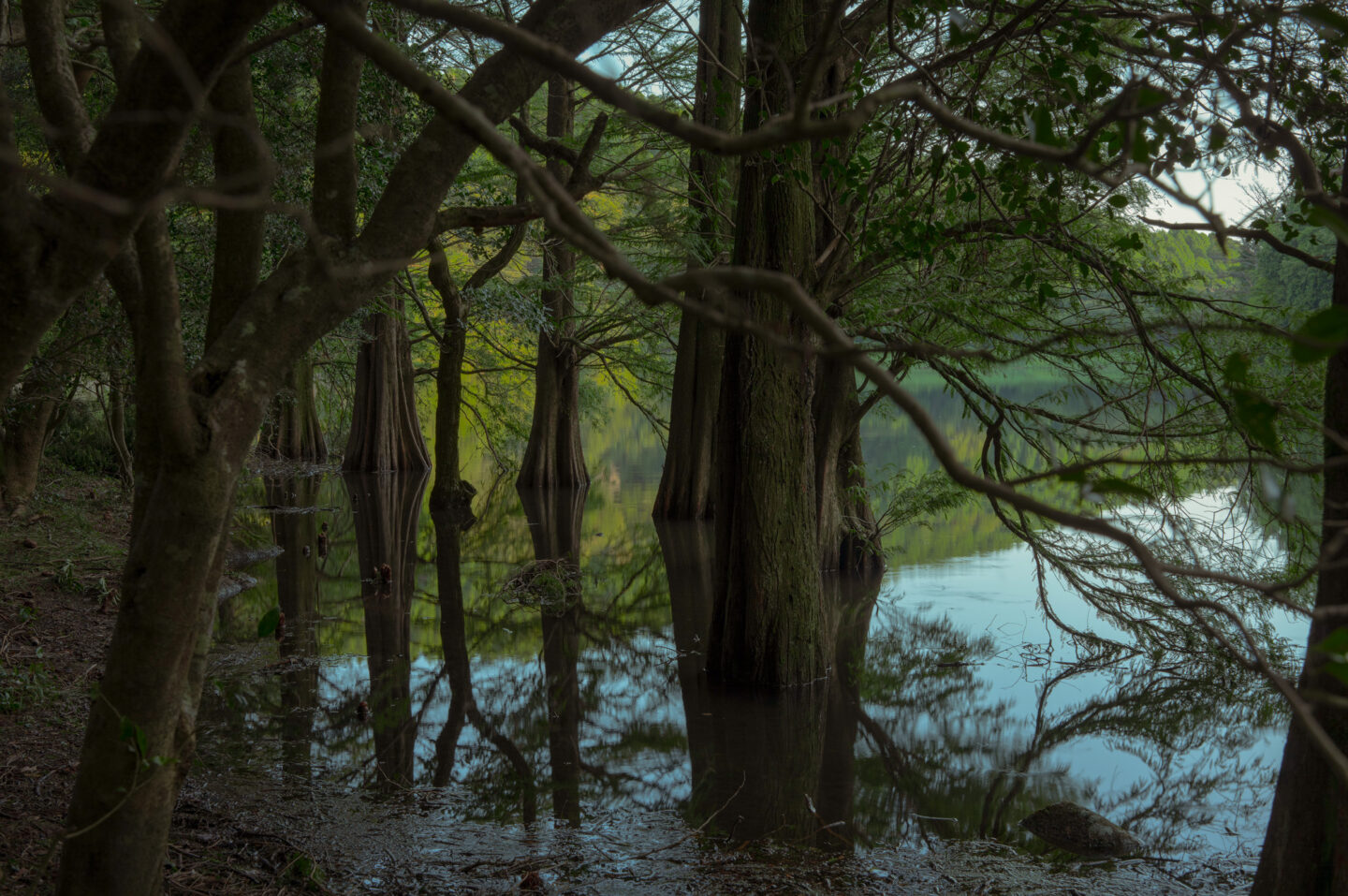 スローシャッターで撮影したが、葉や幹のディテールと滑らかな水面の分離は見事である。黒つぶれしそうな暗部もしっかり描写されている。池の水面に表現されるリフレクションが幻想的である。美しい光景を目の当たりにして眠気も忘れ、夢中で撮影をした。