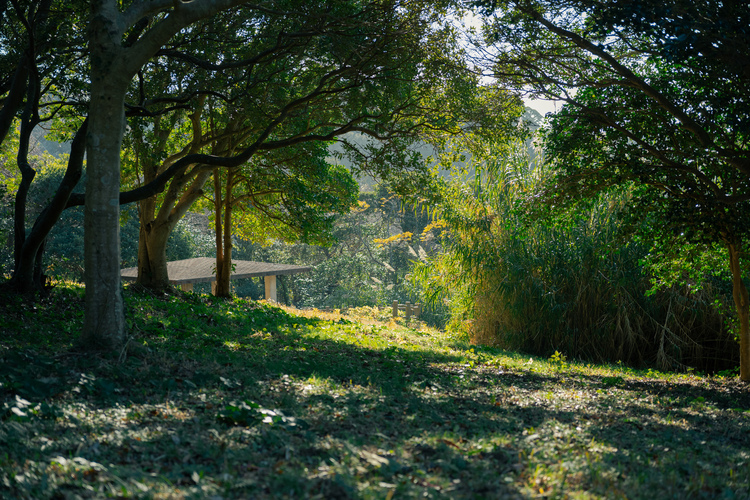 木漏れ日を感じながら、森の中の歩道を歩く、常緑樹が多いこの場所は真冬でも緑を感じることができる。自然のパーゴラのように木々が眩しい陽射しを遮る先に、あまり使われていないであろう東屋が見えた。