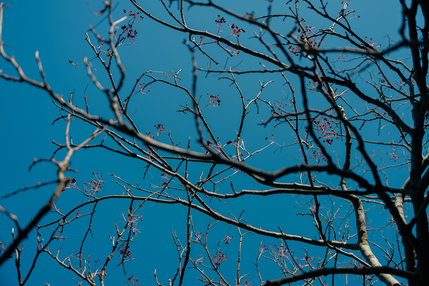 足元を染める赤紫色の実を見つけたので見上げると、そこには閉店した野鳥のレストランがあった。自然のつくり出す色の組み合わせはとても優しい。私の使い古したPENDELTONの毛布に似た、飽きのこない青と赤が心地よい。