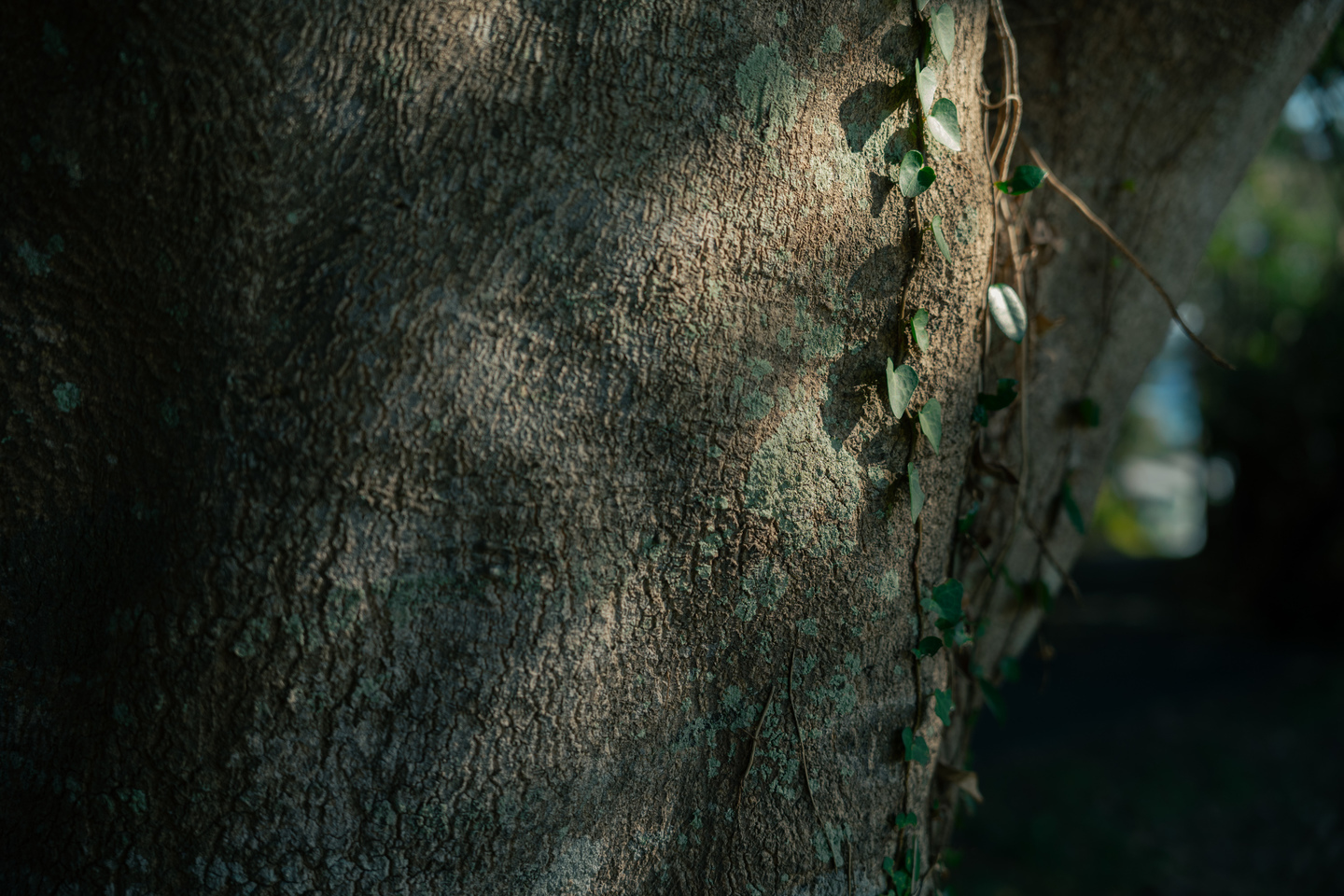 力強い木の幹に細い蔦が垂れ下がる、木の表皮に絵の具で葉を描いたかのように楽しげな苔のアート。葉脈まで繊細に描写する合焦部分と対象的に柔らかいボケ味、このレンズの表現力の高さを感じる。