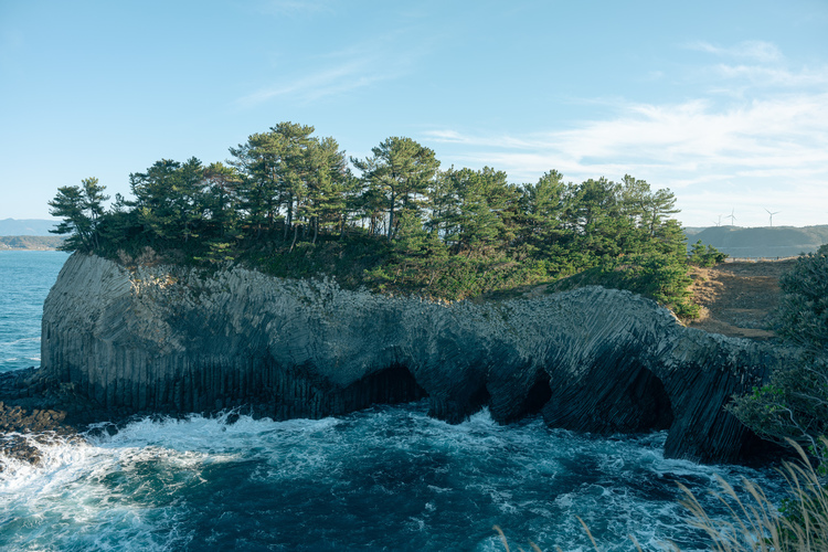 まるで箱庭のように整った半島が斜光に照らされる様子にしばし見惚れる。玄界灘の激しい波が作り上げた洞窟は美しく荘厳な佇まい、あらためて自然は厳しくも尊いものだと感じる。