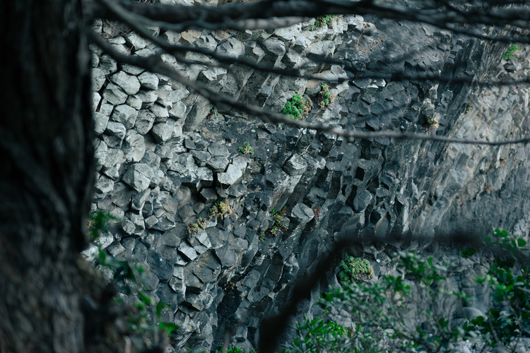 柱状に連なる玄武岩を、崖の松の枝の隙間からのぞくと、六角形の断面が見えた。70mmで引き寄せて撮る、不安定な体勢の撮影もズームレンズだからこそ状況に応じて素早く対応できた。