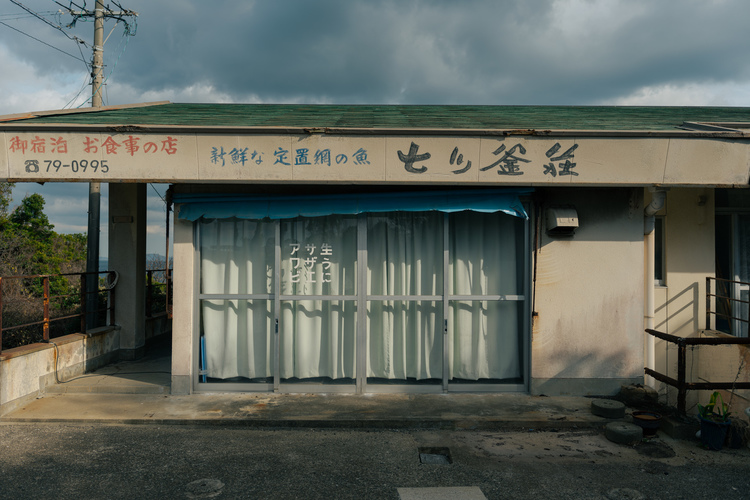 夕方になり気温が一気に下がりはじめた。早足で車にもどる途中、かつてこの場所が多くの観光客で賑わっていたと感じ取れる、趣のあるお店を見つけた。夕日が建物を照らす、経年変化したカーテンの色味が夜の寒気を連れてきた雲とマッチしている。