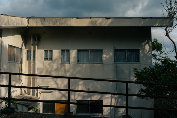 28mm広角で撮影したが、歪曲収差は極めて少ない。屋根の傾きは建物の撓みであることを、正確に描写されたアルミサッシの格子が教えてくれた。