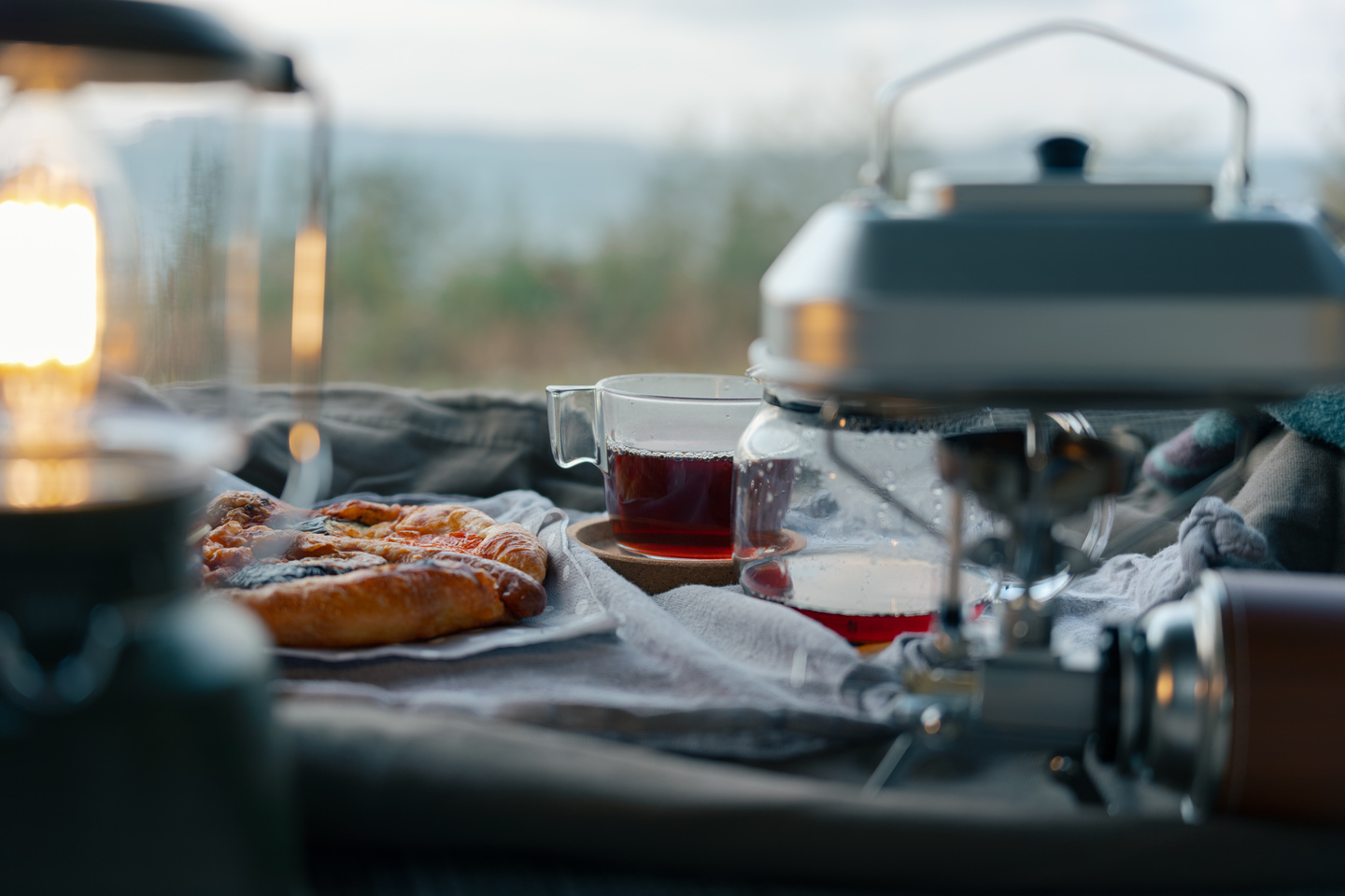 日が暮れはじめた駐車場に戻ると、昼食をとっていないことを思い出し、急にお腹が空いた。車のラゲッジスペースに布をしいて間に合わせの食卓を作り、紅茶を淹れて夕日を見ながら食事をした。冬の美しい夕日と温かい紅茶はとても相性が良い。
