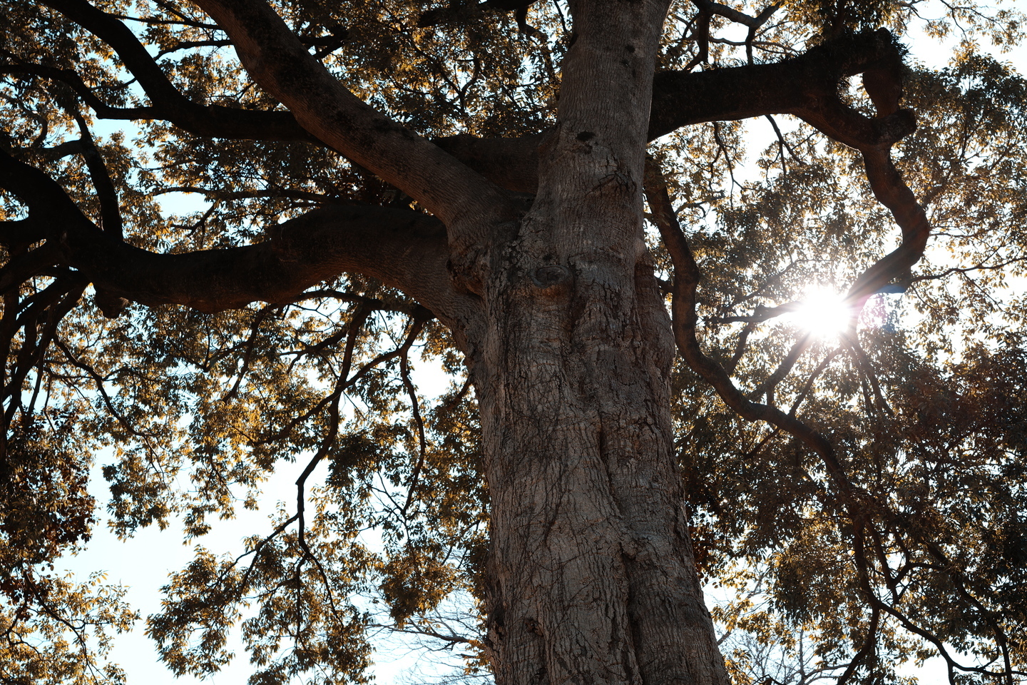 枝の間から太陽光が差し込む大木を撮りました。おかしなゴーストやフレアの発生もなく、木の表面のディテールを良好に写しとっています。葉の精細感もいい感じですね。