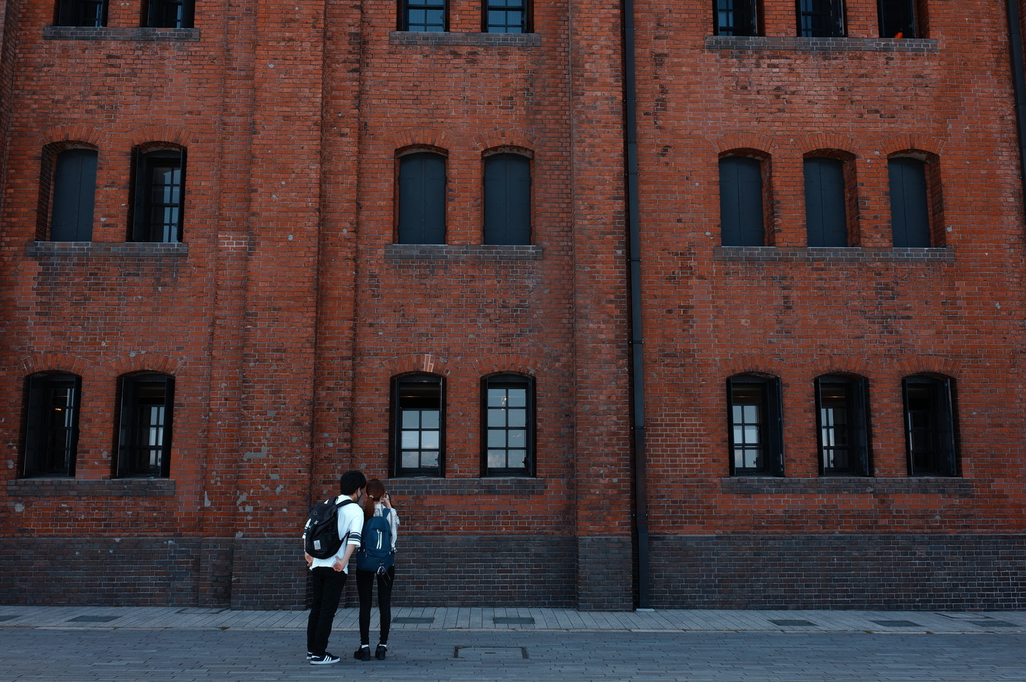 みなとみらいの名所・赤レンガパークでカップルをスナップ。ふたりの服装から、赤レンガ倉庫のディテールまでしっかりと捉えることができました。日陰の微妙な発色も自然にすっきりと写しとめることが出来ました。