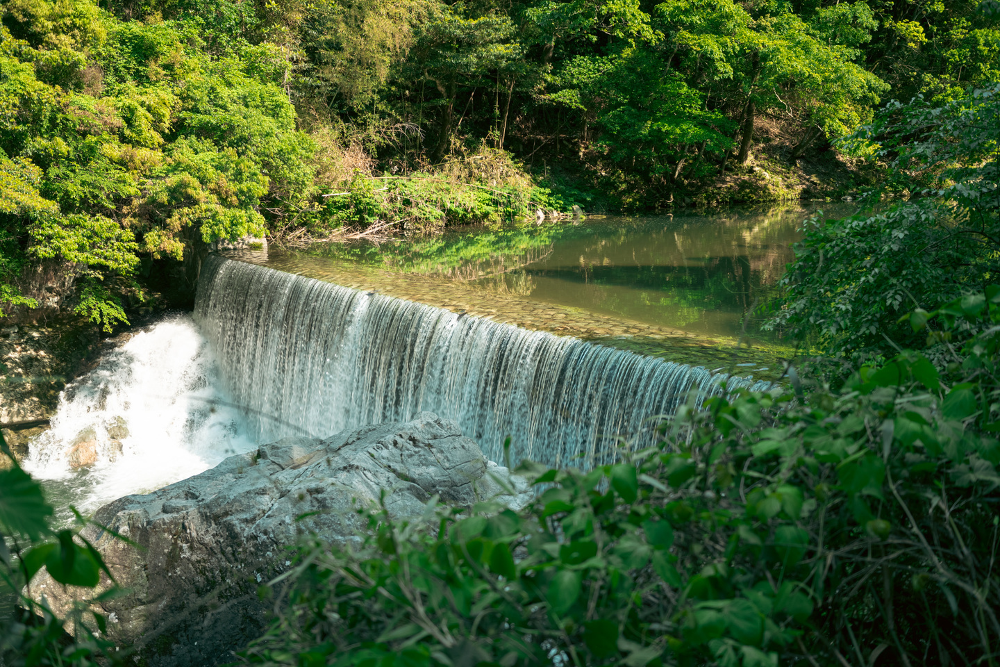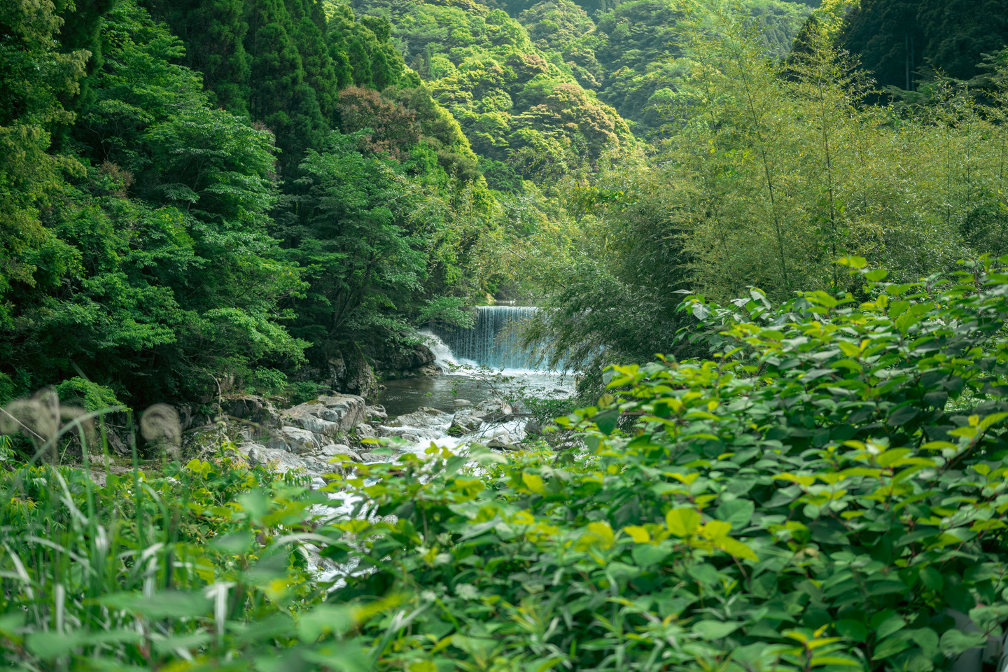 ここを通る度に、一瞬見えるこの景色が以前から気になっていた。車を停めるなりシャッターを切る。生い茂る木々と渓流の奥に見える落差工(人工の滝の様に見える部分)の直線がアクセントとなって美しい。