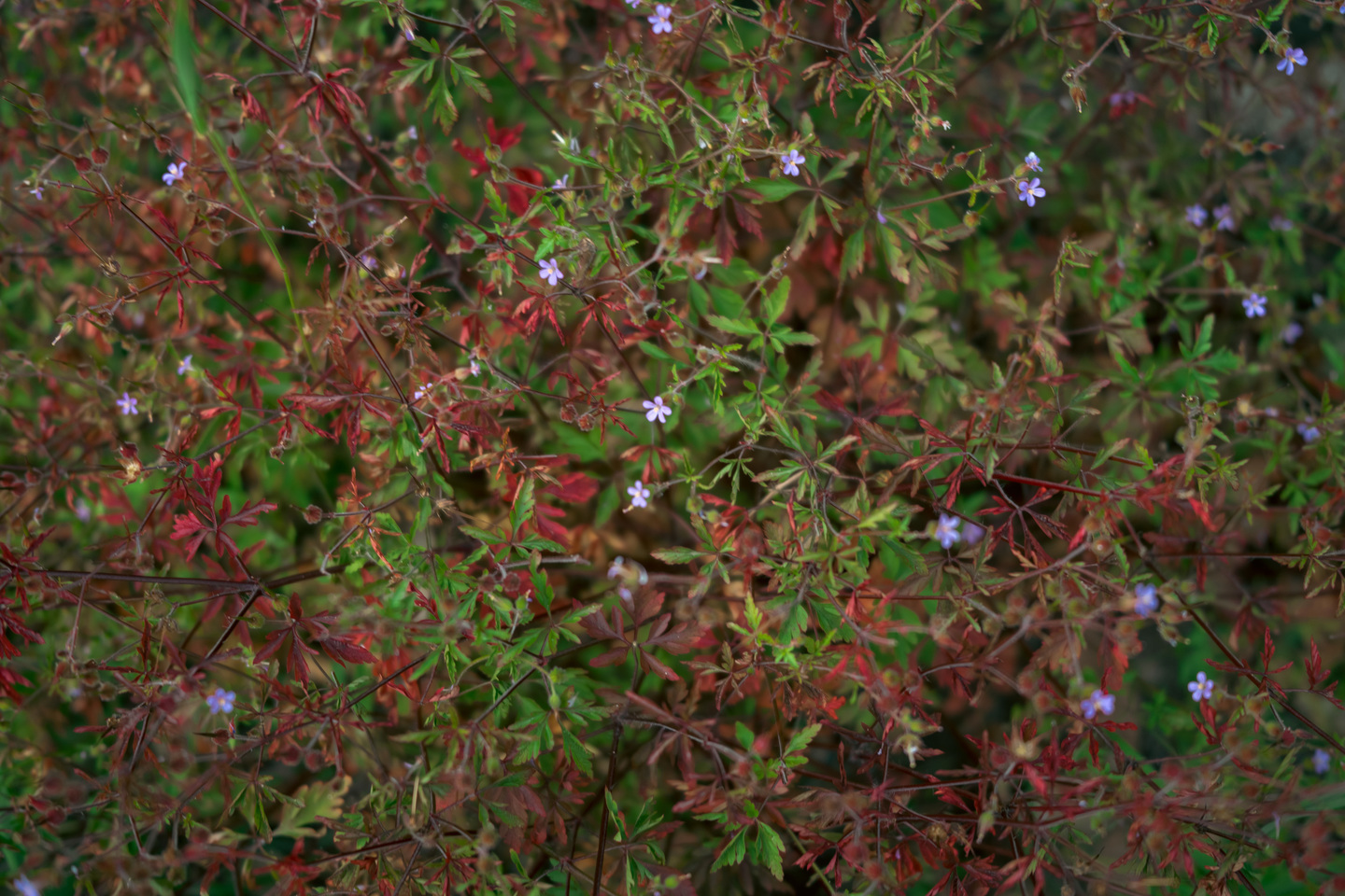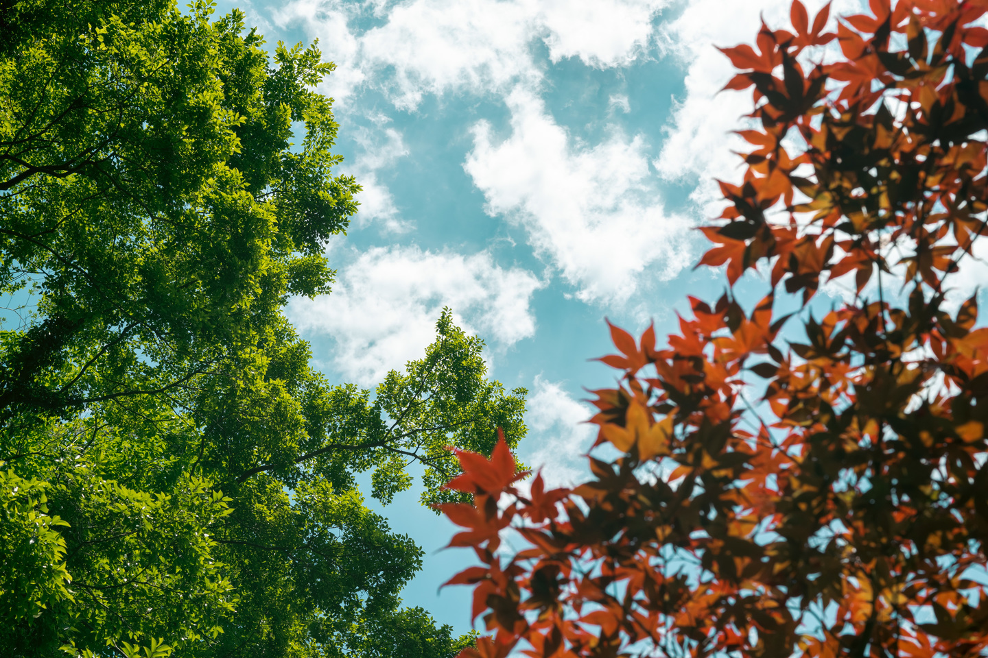 見上げると青と緑と赤が見事にレイアウトされていた。よくある光景かもしれないが、見ていて晴れやかな気持ちになる写真は好きだ。F8まで絞ってしっかりと解像感を出した、手前の紅葉のボケはとても自然で違和感がない。