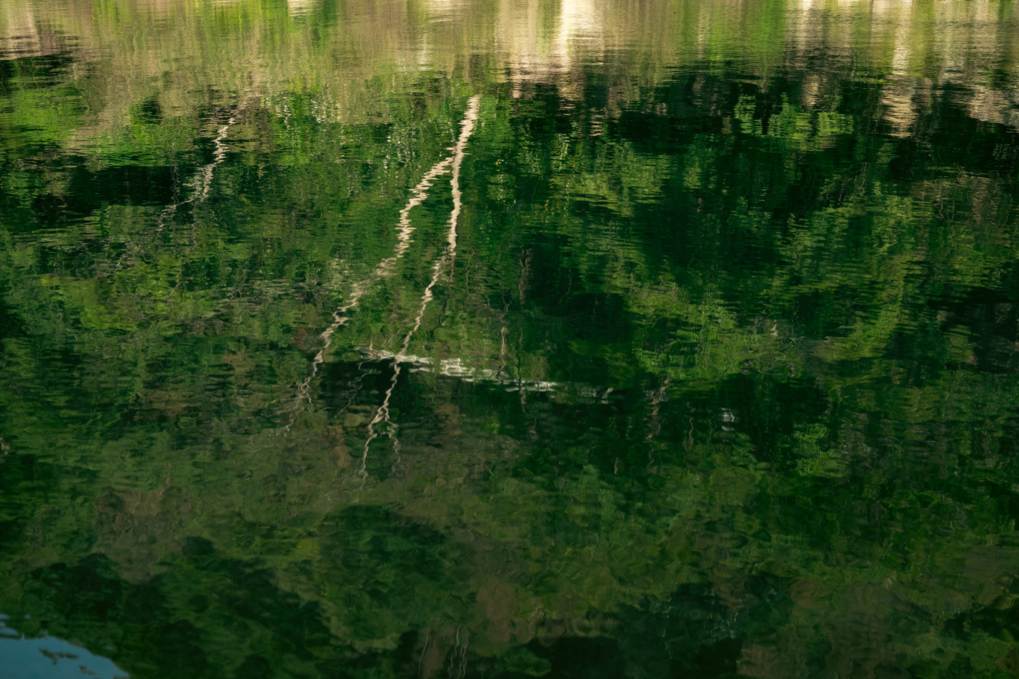 美しい水没林を横目に歩きながら、自分好みの構図を探すのも楽しい。エメラルドグリーンの水面は、磨りガラスのように奥の木々をぼんやりと映しだす。
